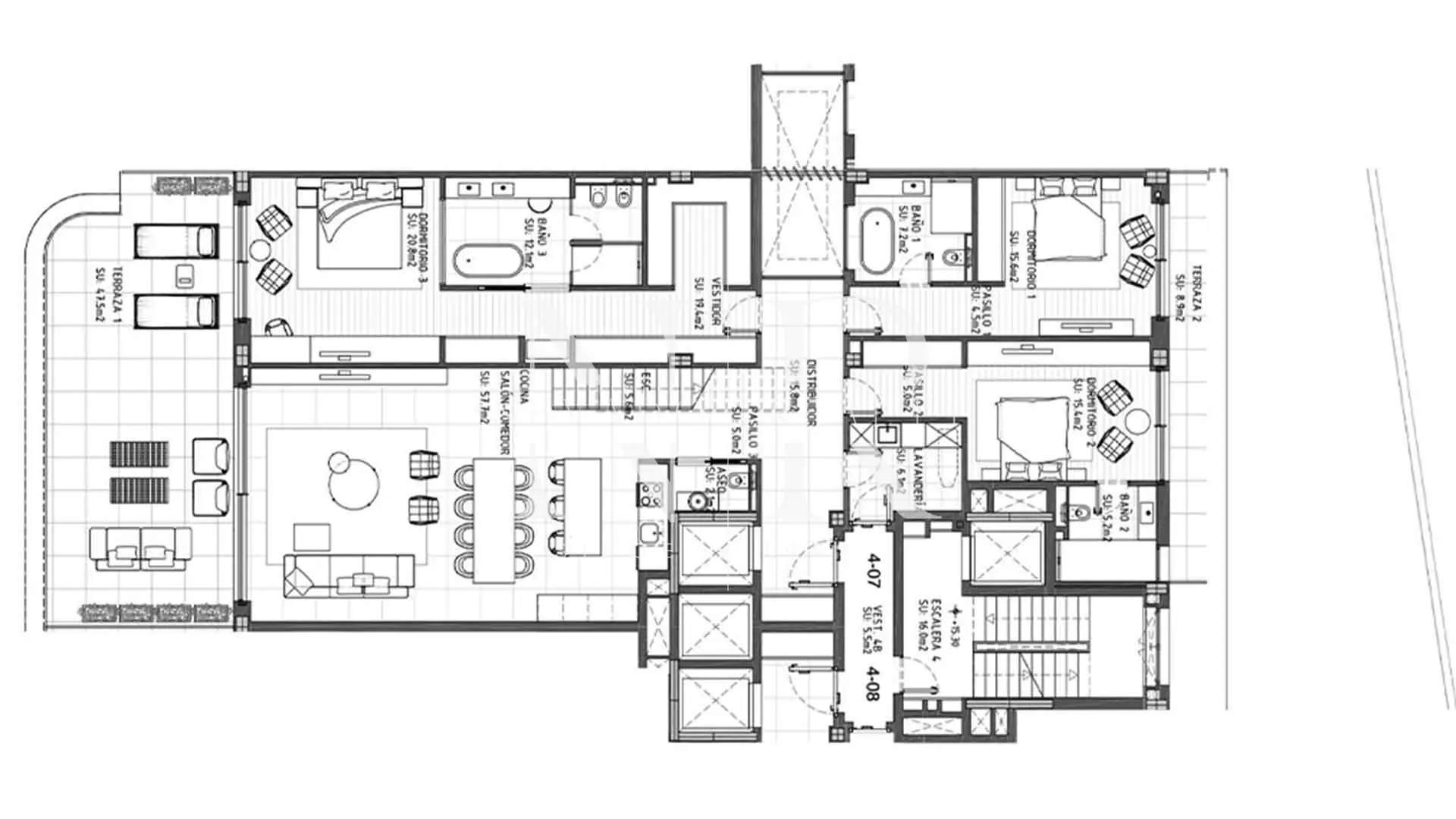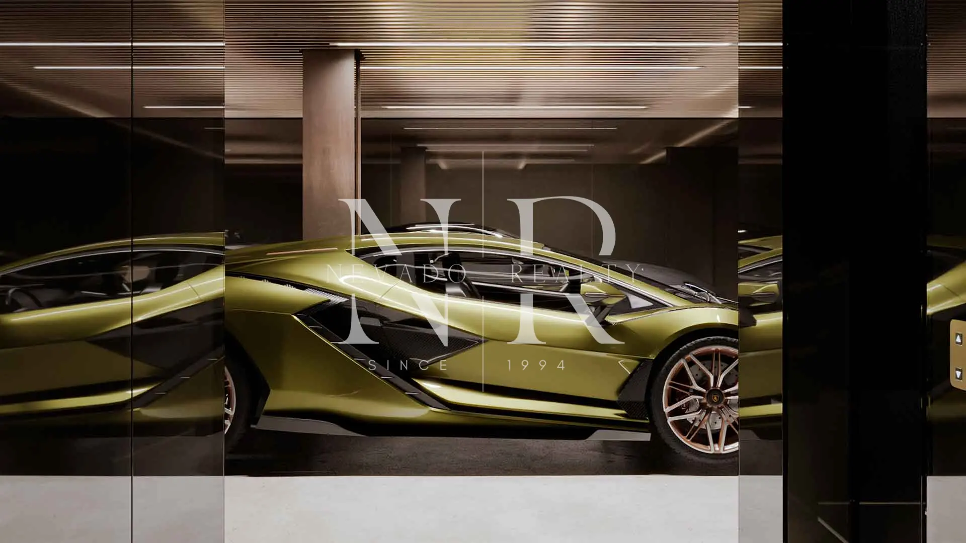 The penthouse includes ownership of a private 112 m² Supergarage. This space is not just a car park, but a private room in the basement with capacity for 4 or 5 vehicles, a storage area and, most importantly, a private lift that takes the owner directly from their garage into the penthouse. In addition, it features a 24/7 concierge service and access to 3,000 m² of communal areas, a spa and a golf simulator.