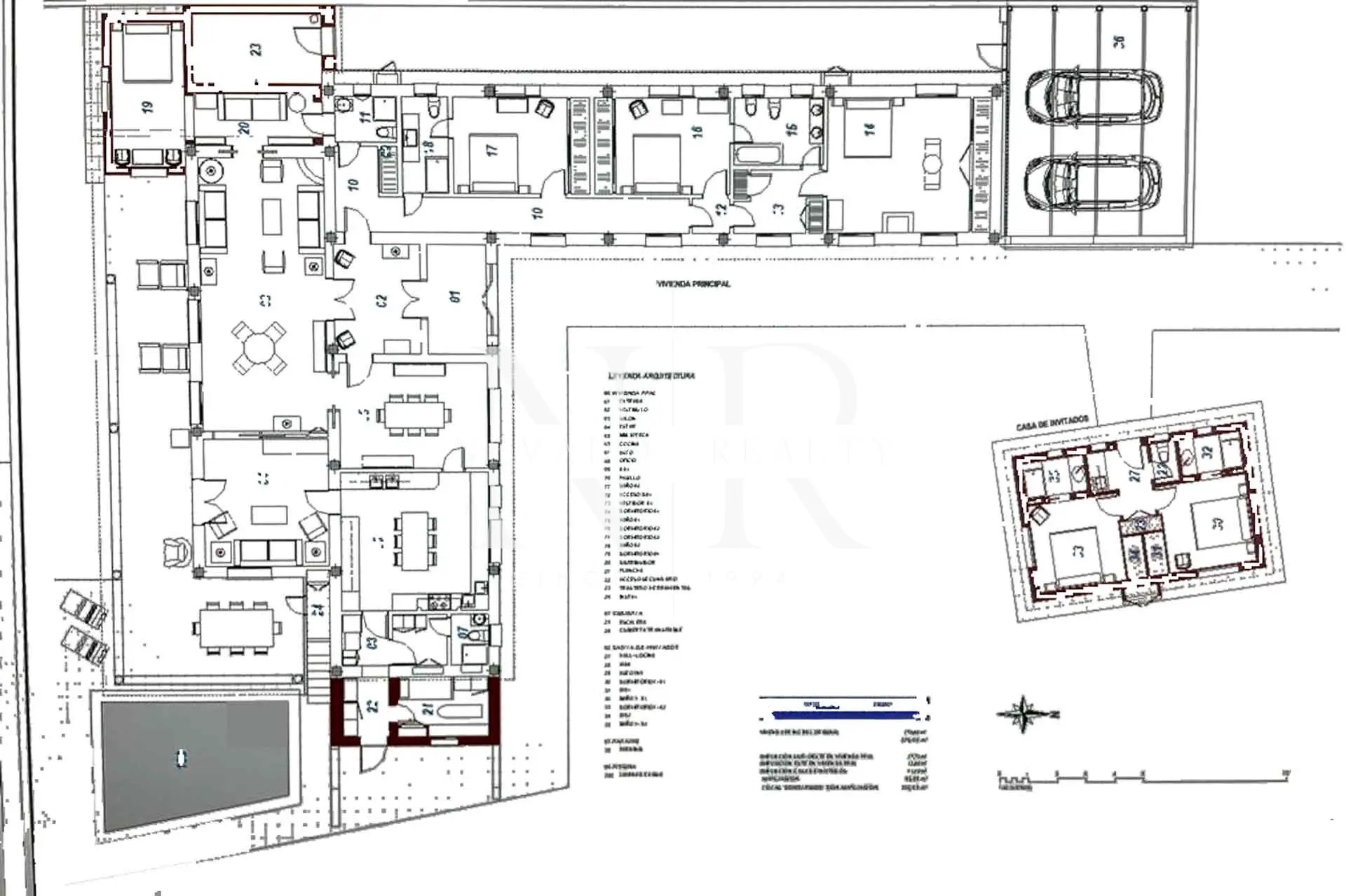 This villa is designed in an L shape. On one of its sides we find the bedroom area. 4 bedrooms and three bathrooms are found in this wing. At the entrance is the parking, with capacity for up to 4 cars.