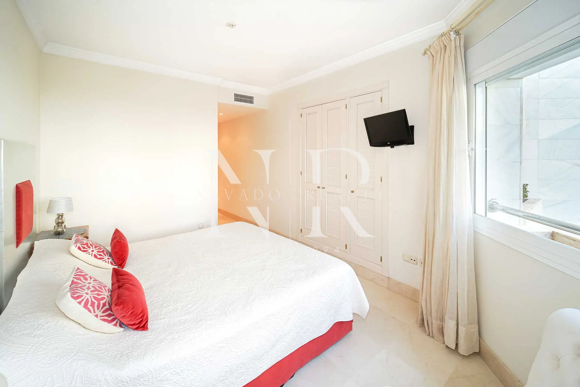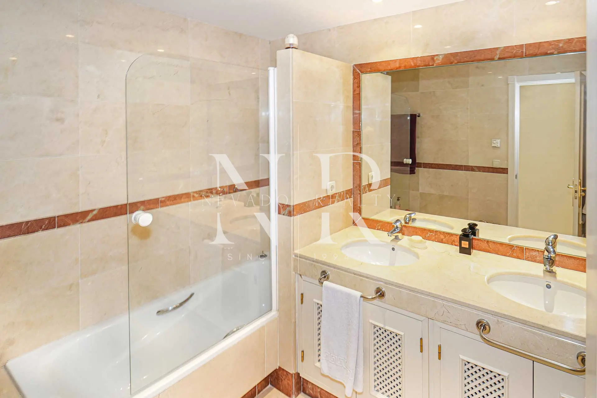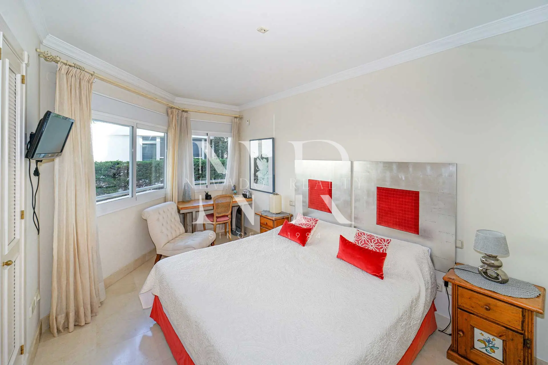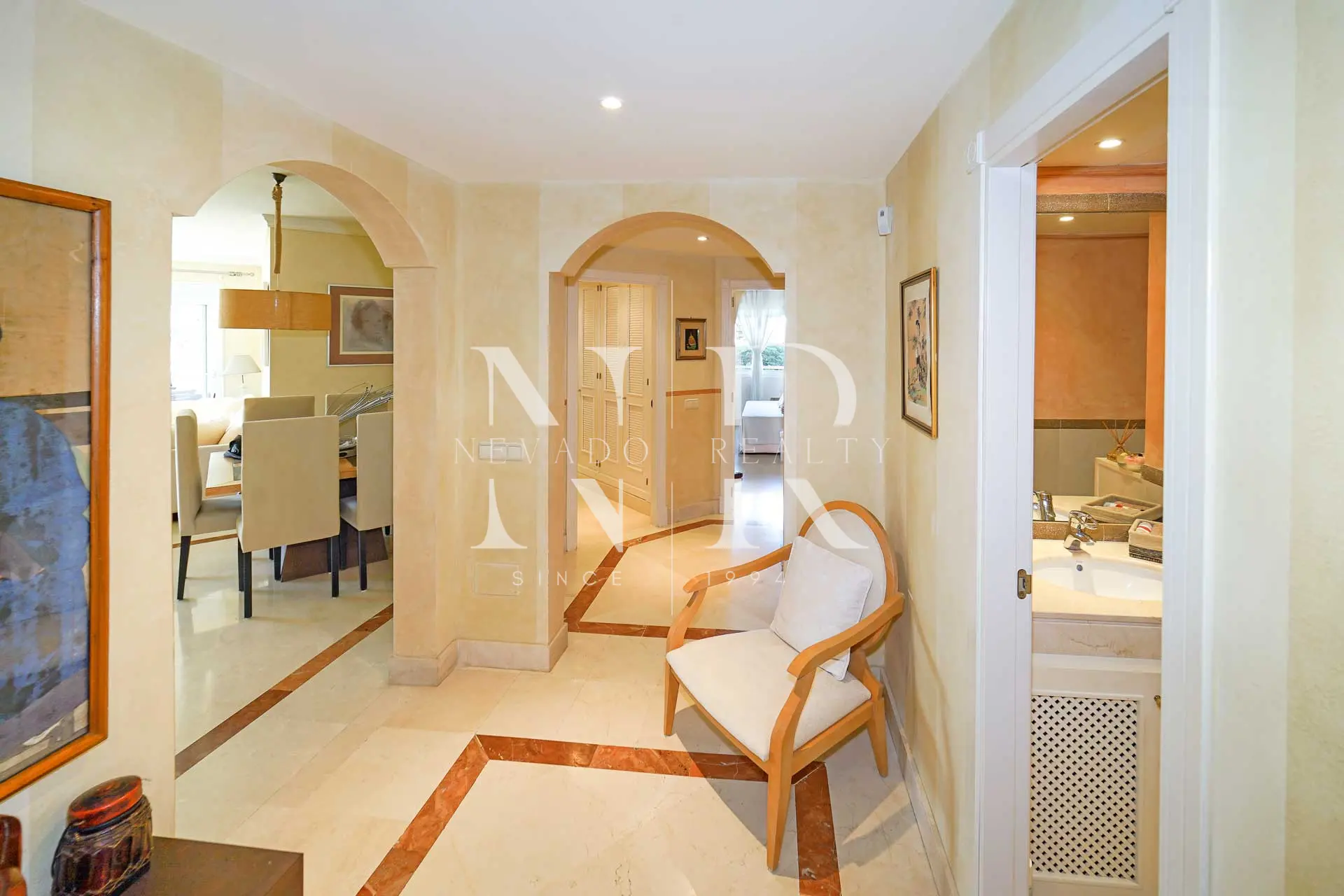 It is an apartment with 3 bedrooms and 3 bathrooms. The living room and dining room are in the same room although with a certain separation due to the distribution. It has a large covered terrace with a seating area and another dining room. Glazing allows owners to enjoy it throughout the year and appreciate the garden views. The fully equipped separate kitchen has an outside laundry area. It is very neat and new. The appartment is sold fully furnished. Decorated with warm camel, beige and white tones which mix with darker wooden furniture and detail. The bathrooms are all made of marble. Additional features are A/C and marble floors. The urbanization has a community pool, direct access to the beach and 24-hour concierge service. The property includes 1 underground garage space and 2 storage rooms.