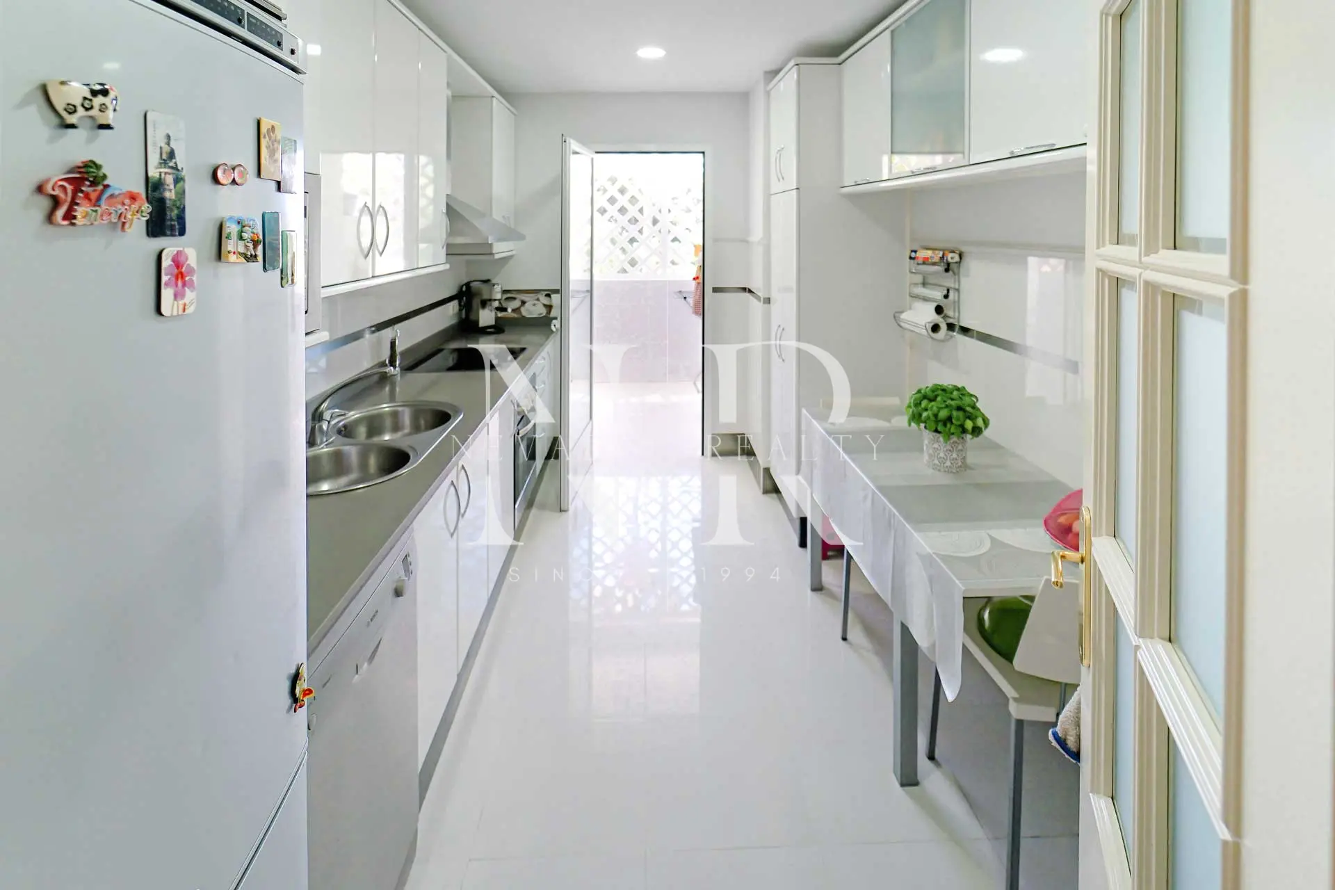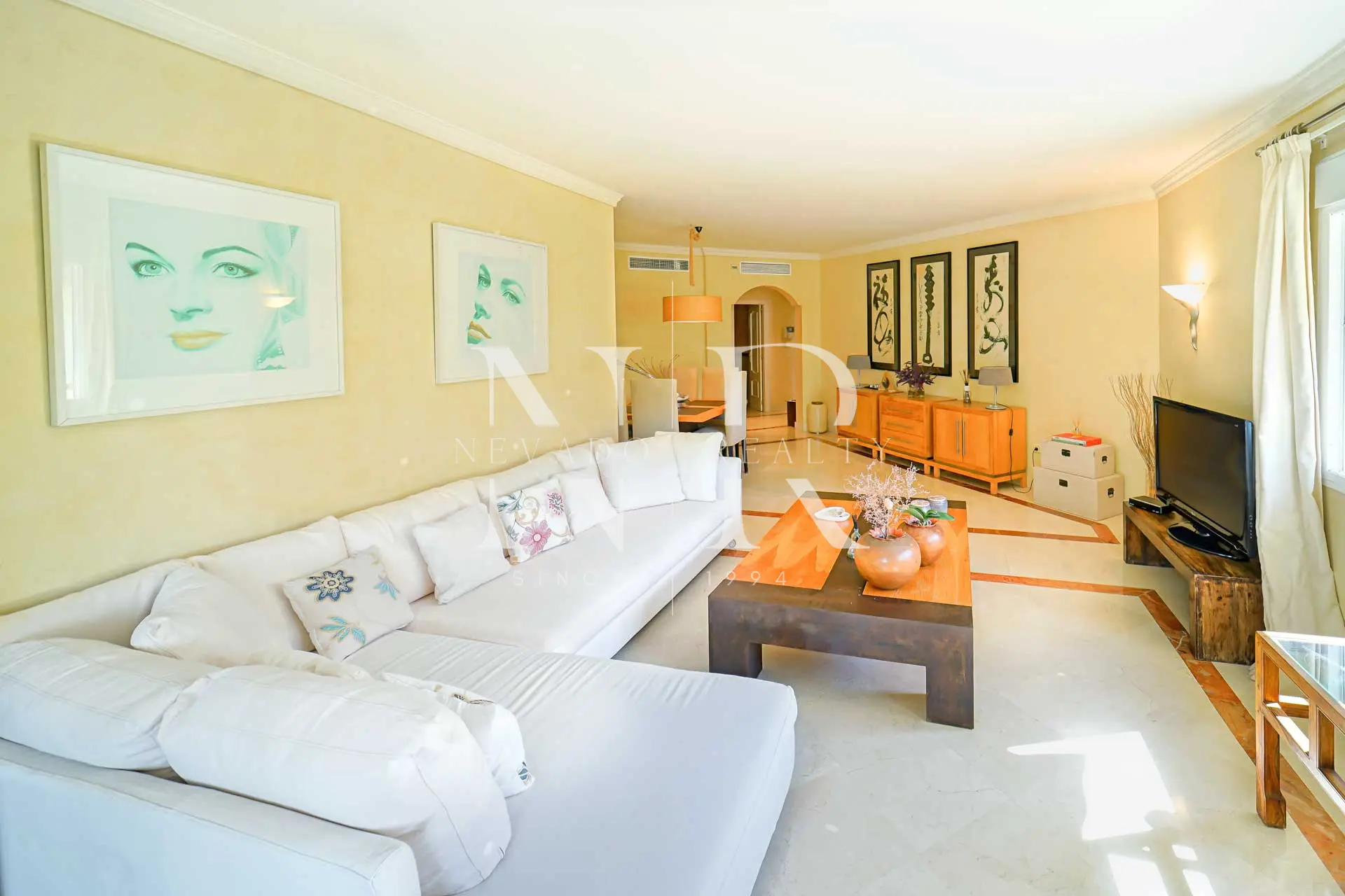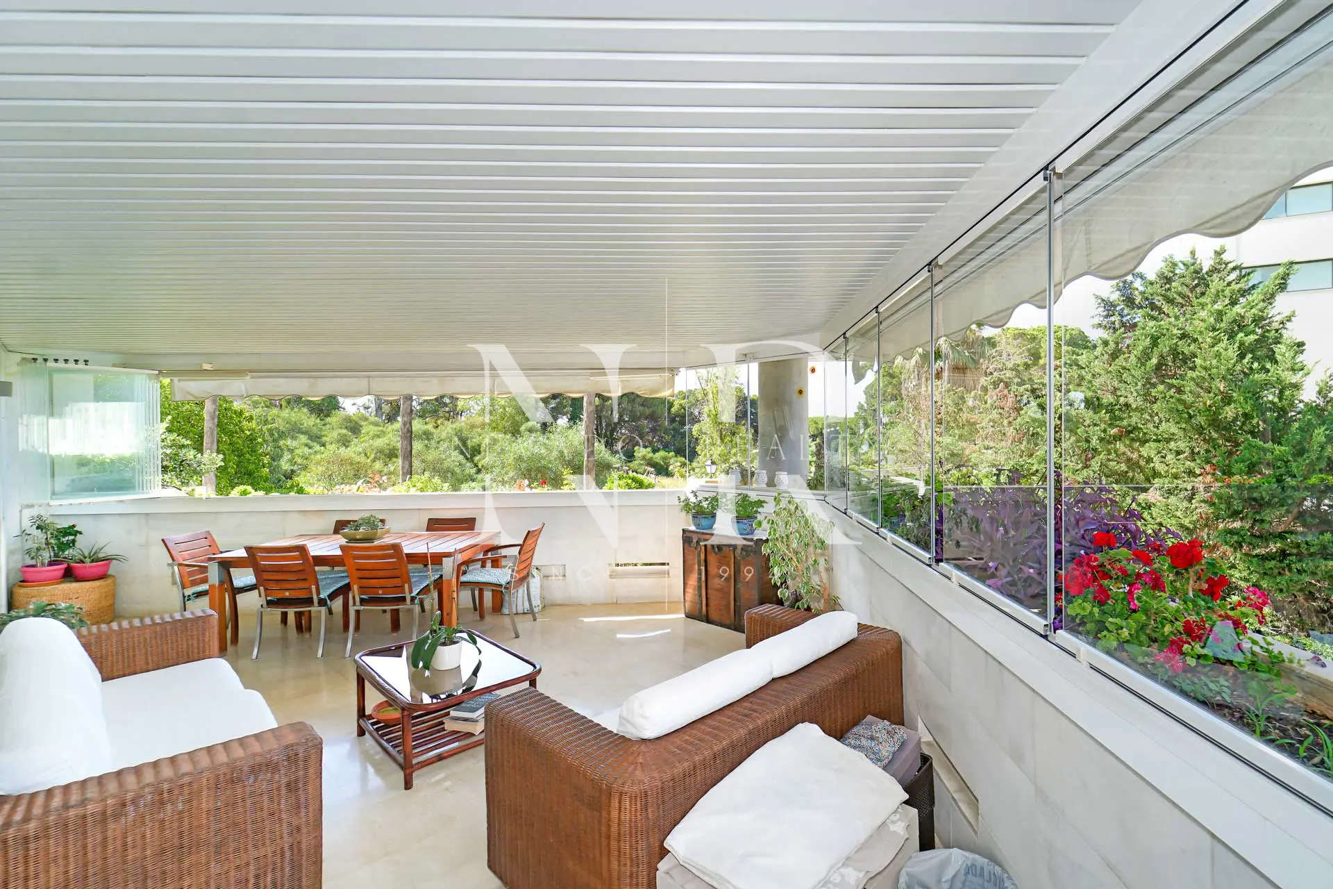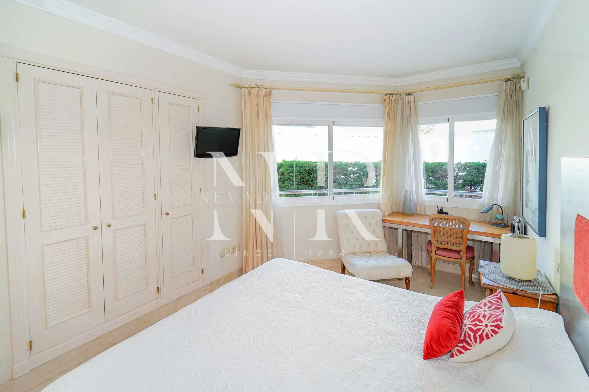 It is an apartment with 3 bedrooms and 3 bathrooms. The living room and dining room are in the same room although with a certain separation due to the distribution. It has a large covered terrace with a seating area and another dining room. Glazing allows owners to enjoy it throughout the year and appreciate the garden views. The fully equipped separate kitchen has an outside laundry area. It is very neat and new. The appartment is sold fully furnished. Decorated with warm camel, beige and white tones which mix with darker wooden furniture and detail. The bathrooms are all made of marble. Additional features are A/C and marble floors. The urbanization has a community pool, direct access to the beach and 24-hour concierge service. The property includes 1 underground garage space and 2 storage rooms.