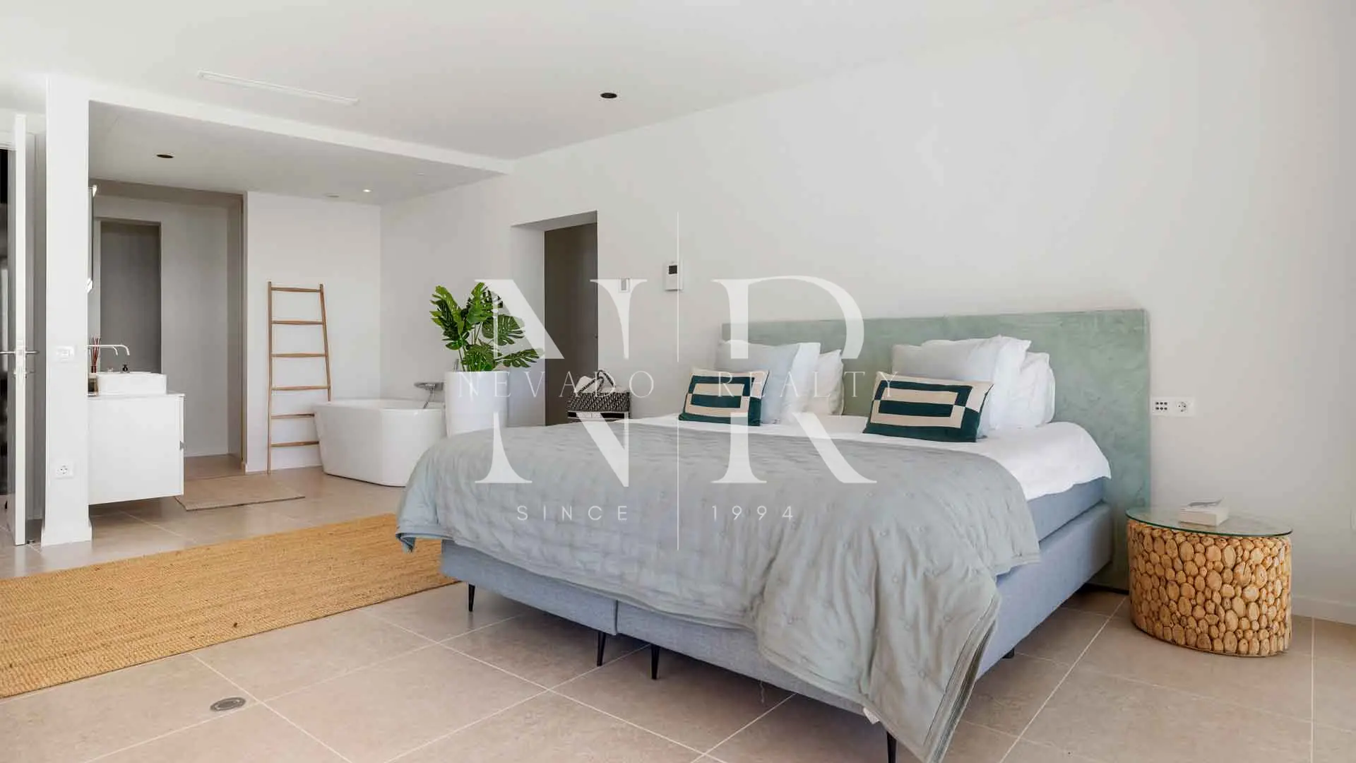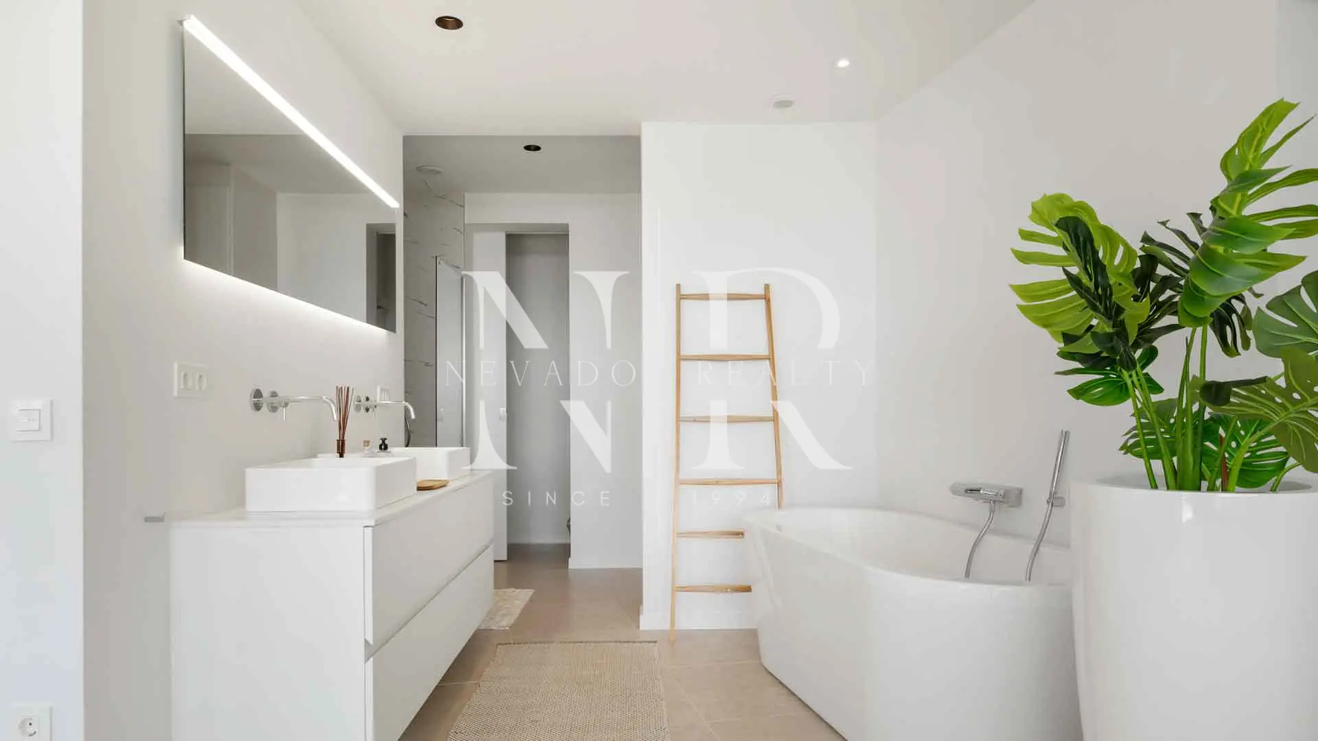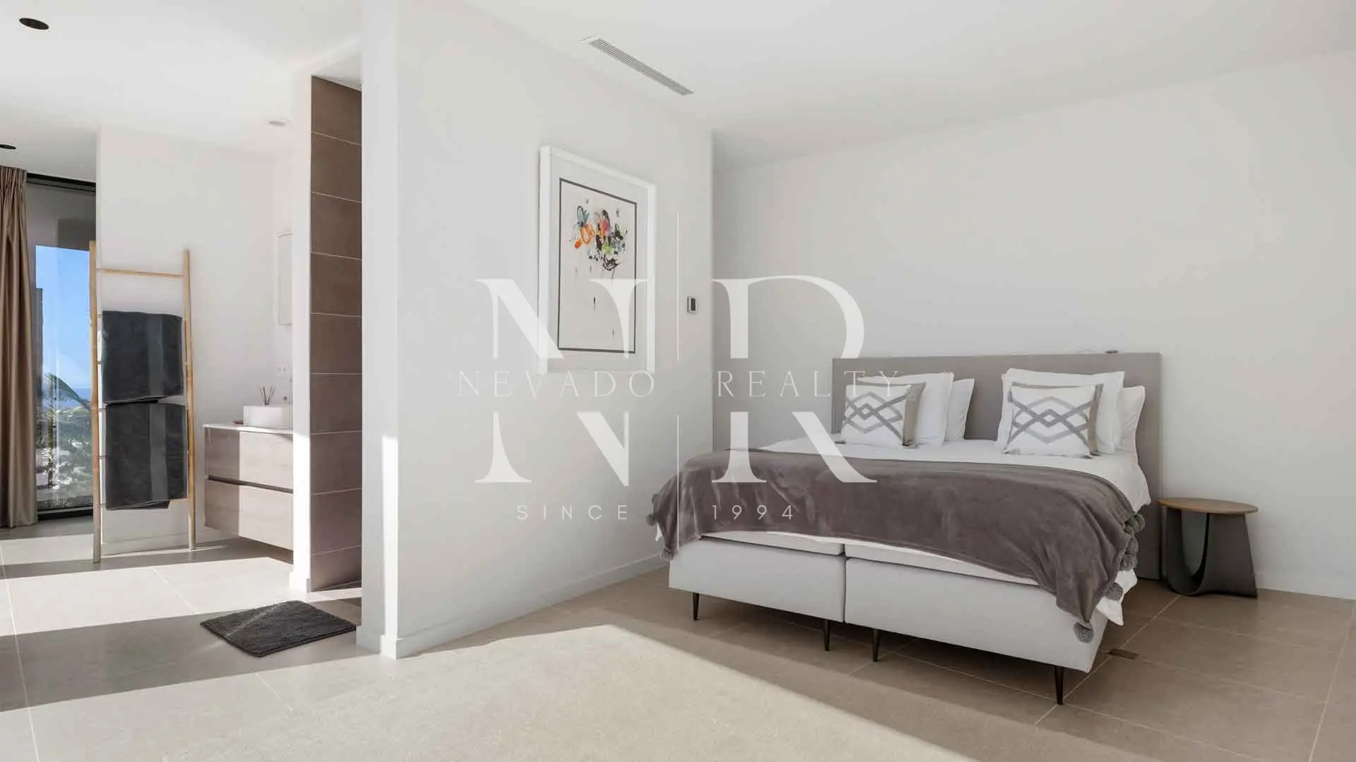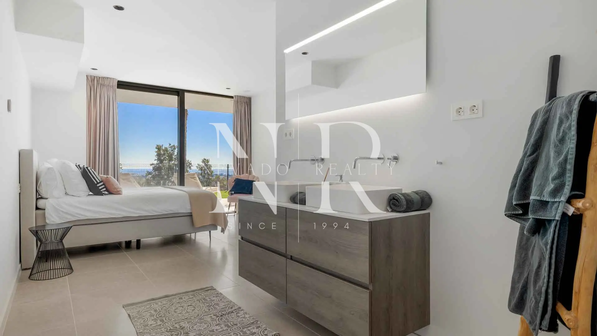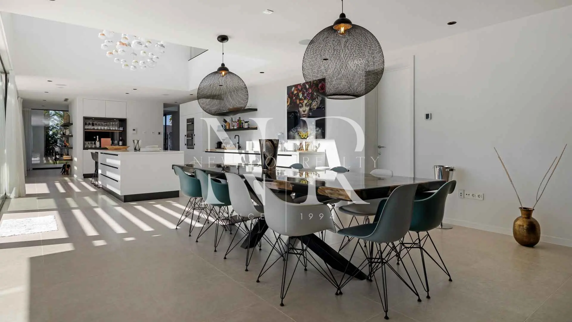 Set on a generous plot of 1,195 m², the villa offers 407 m² of living space and 86 m² of terraces, perfectly designed to enjoy the Mediterranean lifestyle. The interior is characterised by its modern lines, high-quality materials and spacious rooms. The living area includes an elegant living room with a fireplace, a fully equipped kitchen and a dining room with direct access to the outdoor areas. Each of the five bedrooms has an en-suite bathroom, including a luxurious master suite with panoramic views. In addition, the property is equipped with air conditioning, underfloor heating and double glazing to ensure comfort throughout the year.