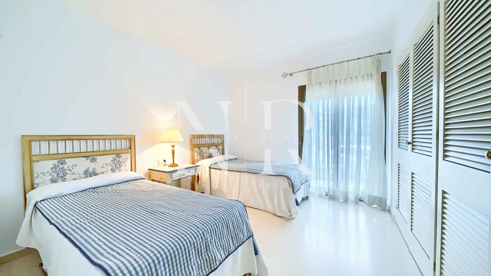 Upon entering the apartment, you’ll find a huge living room with a fireplace, from which you can access a beautiful, very private covered porch overlooking the immense garden and communal swimming pools. Behind the living room is a very functional independent kitchen with access to a large laundry room. It has two spacious bedrooms with two beautiful en-suite bathrooms, one with a shower (the master bedroom) and the other with a toilet; both have a dressing area. The master bedroom also has direct access to the same porch as the living room, and the second bedroom has a small balcony overlooking the parking area. The porch has new awnings and offers great privacy, allowing you to enjoy the summer sun in the cool evenings.