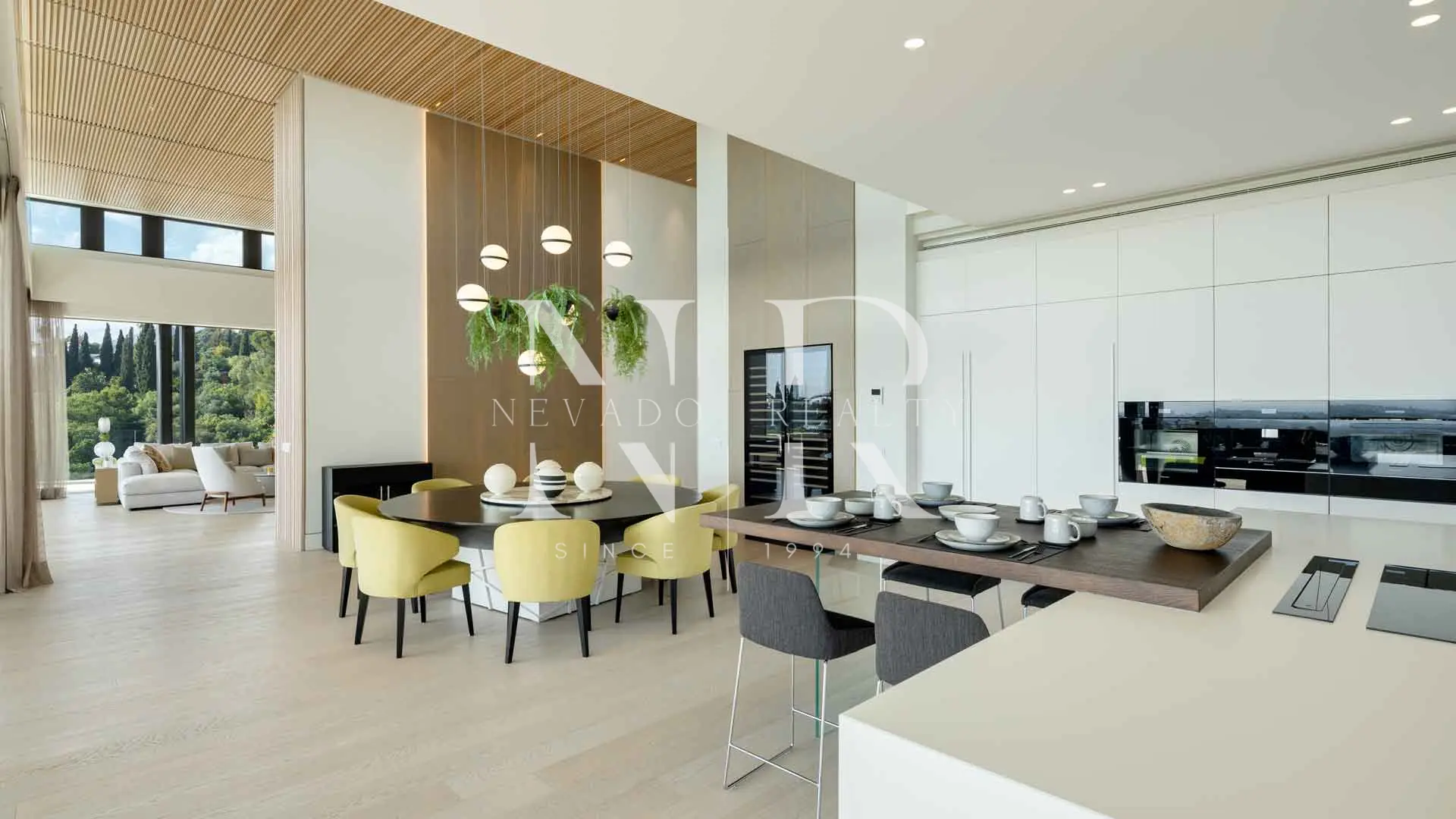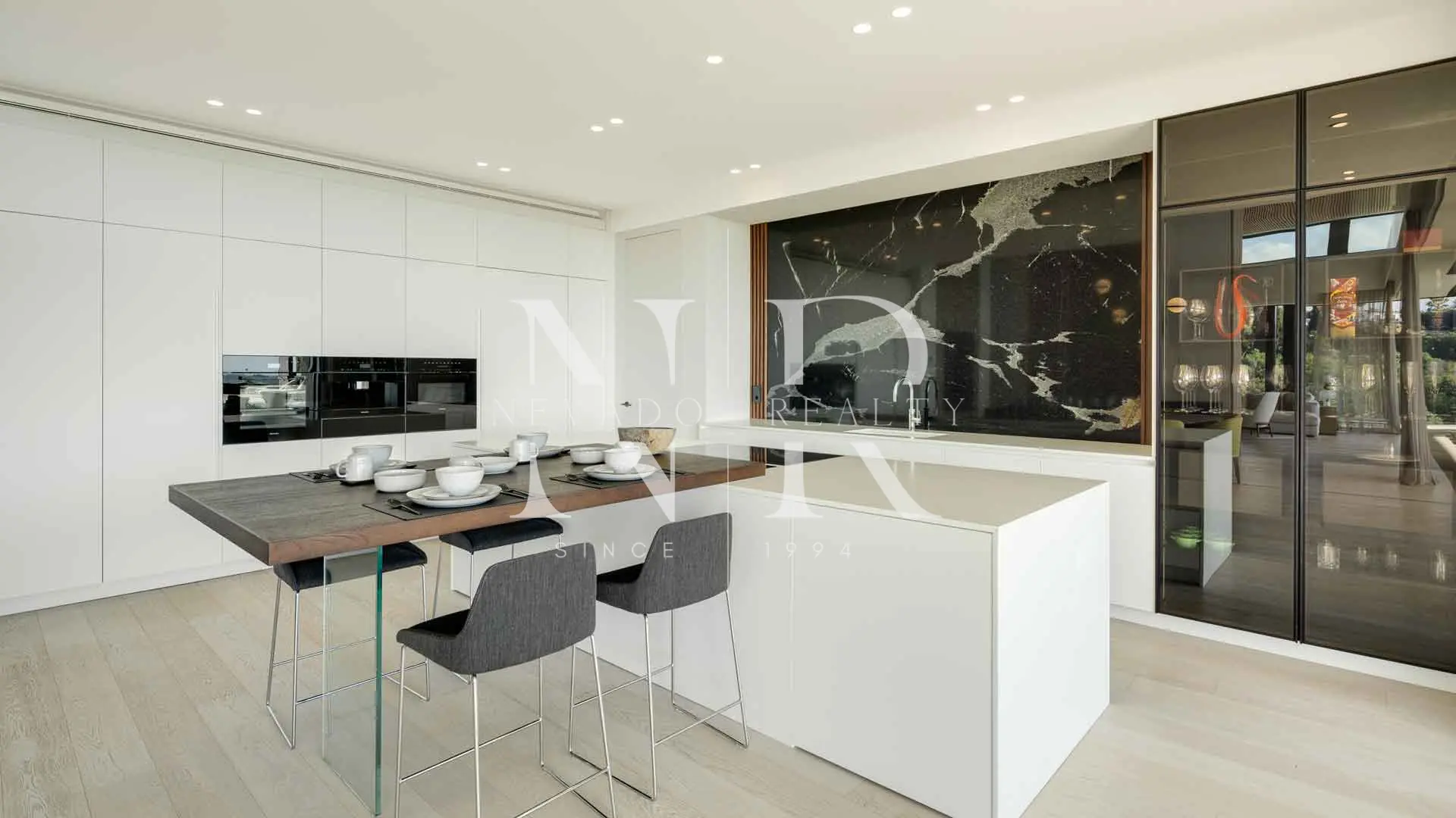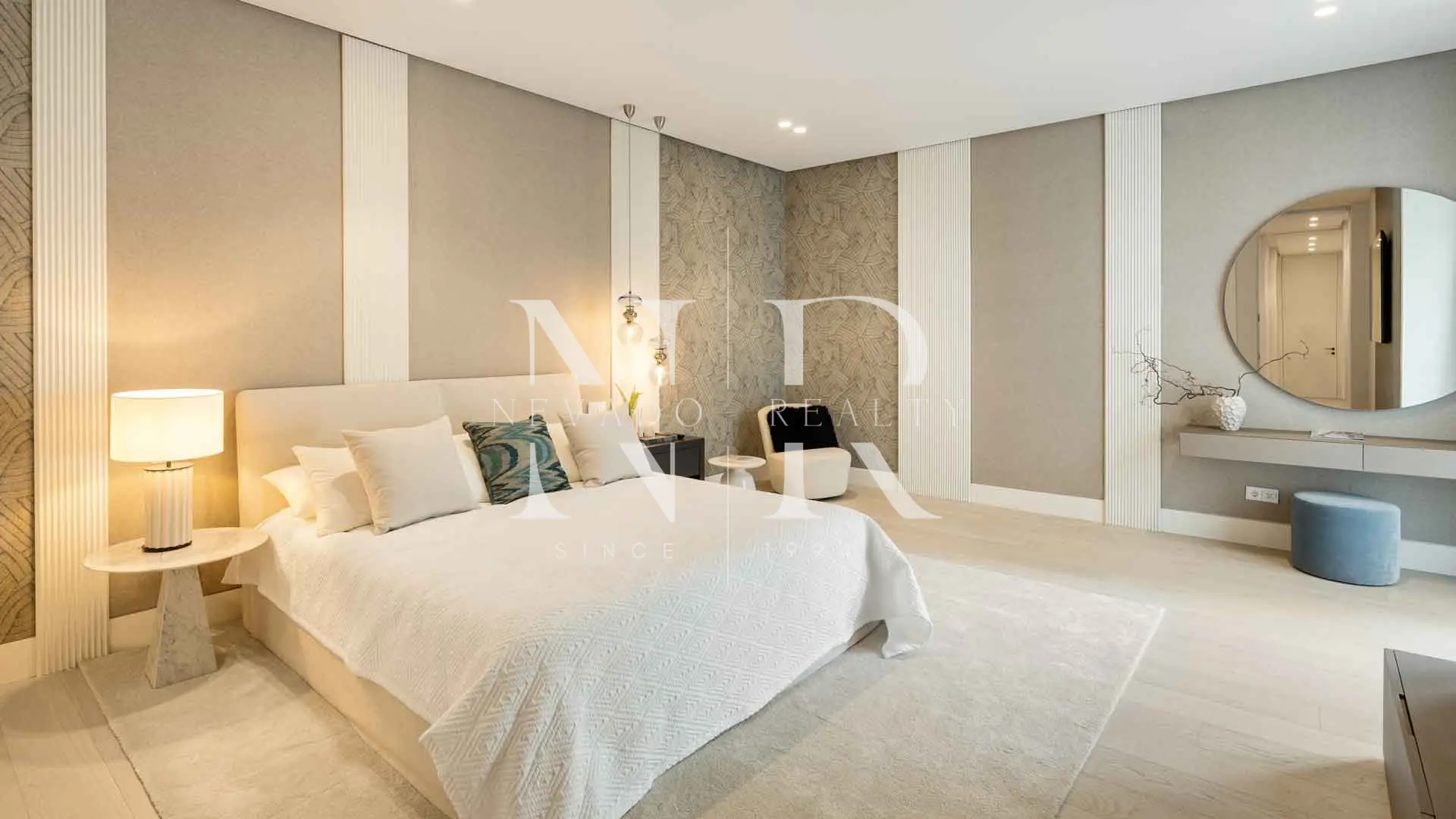 As you enter, you are greeted by large windows and high ceilings, which not only flood the interiors with natural light, but also frame breathtaking views of the sea and the landscape. The interiors, designed by Aalto Exclusive Design, feature a palette of neutral tones.
