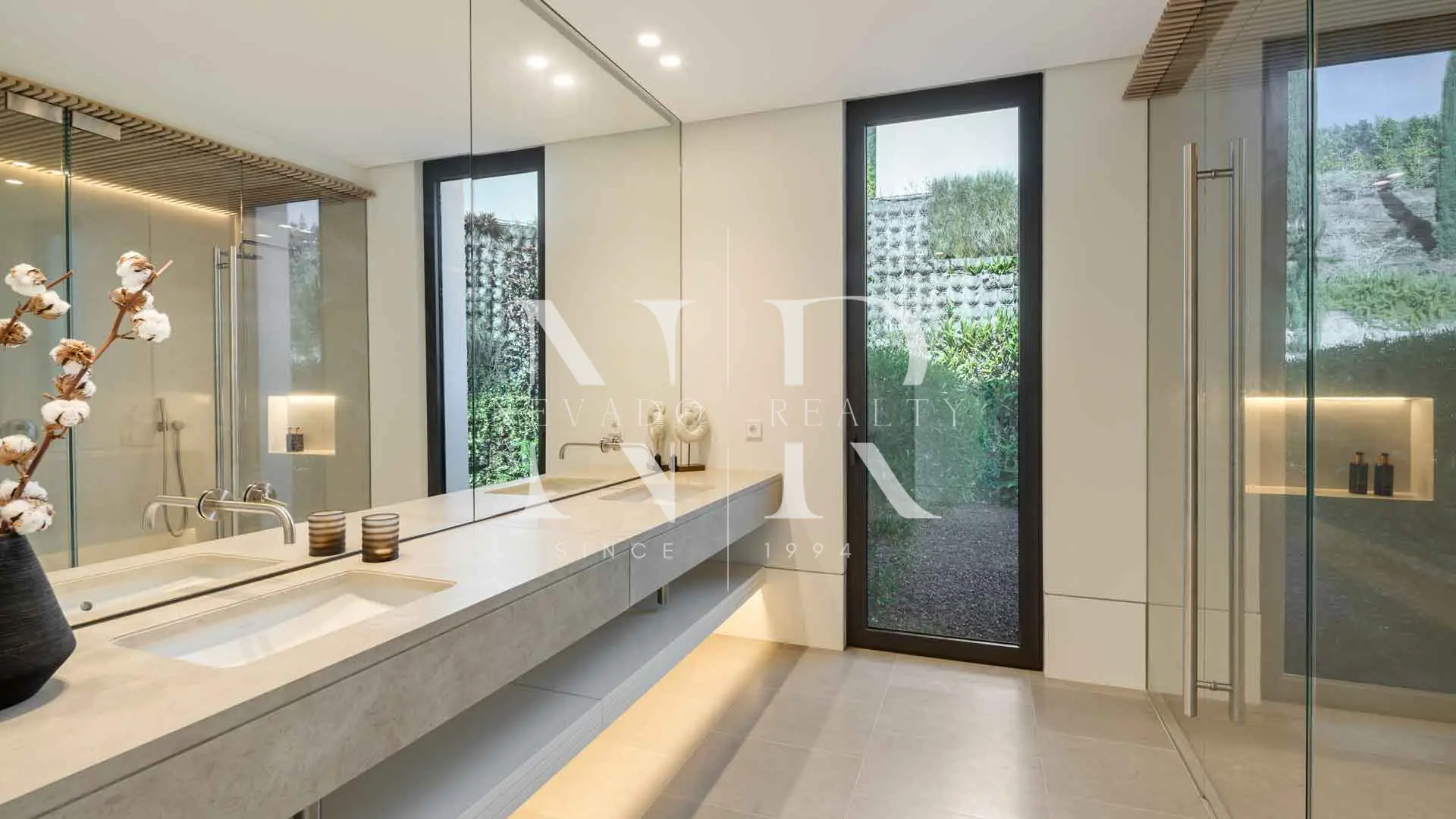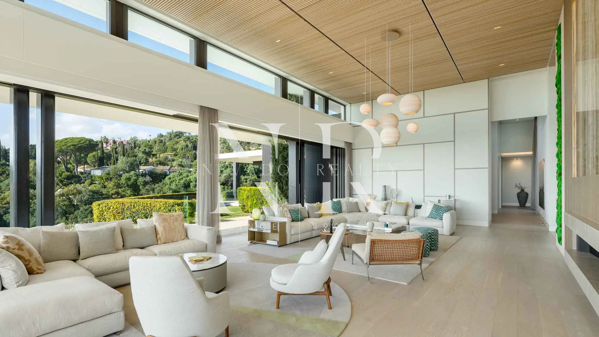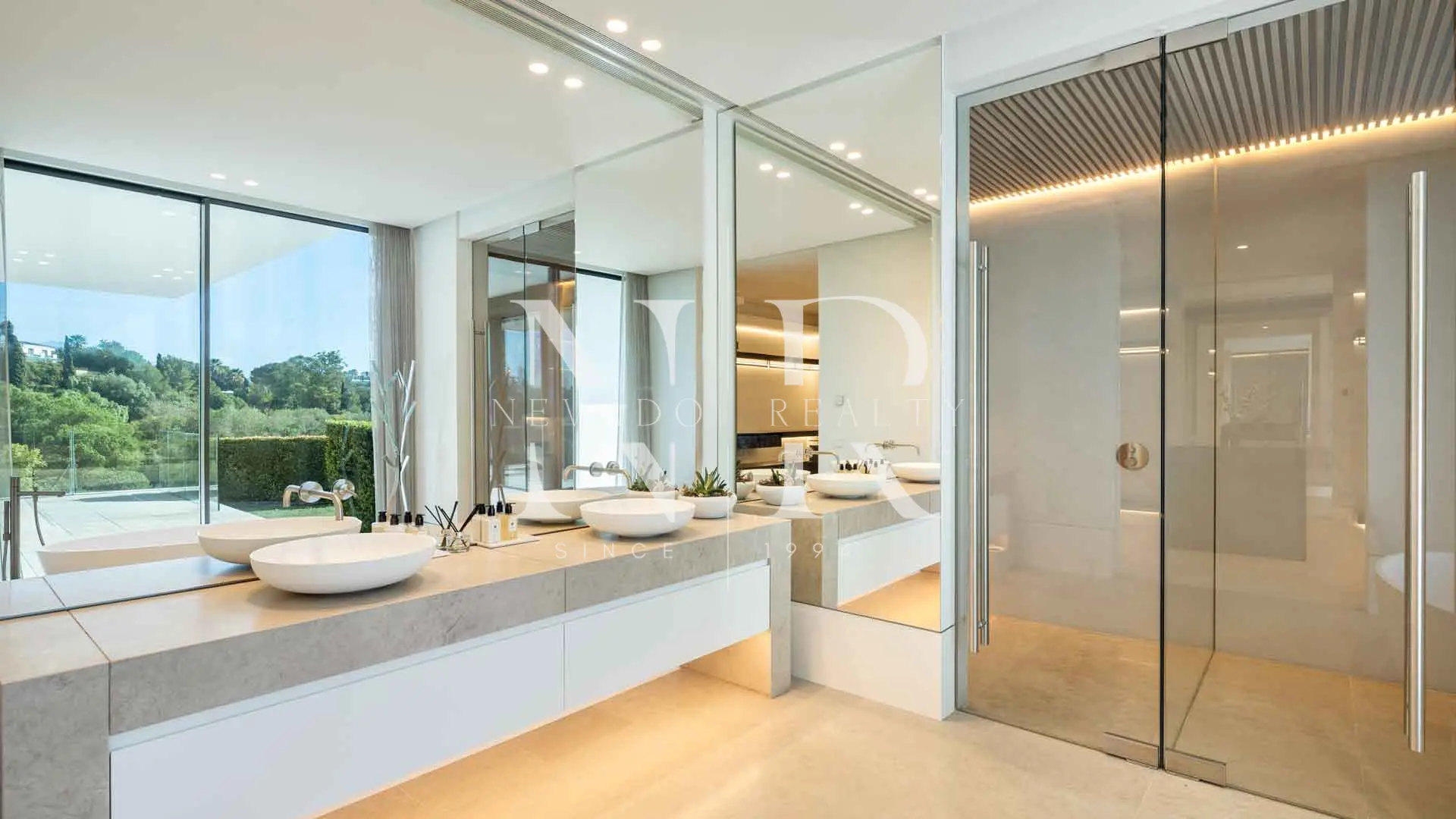 As you enter, you are greeted by large windows and high ceilings, which not only flood the interiors with natural light, but also frame breathtaking views of the sea and the landscape. The interiors, designed by Aalto Exclusive Design, feature a palette of neutral tones.