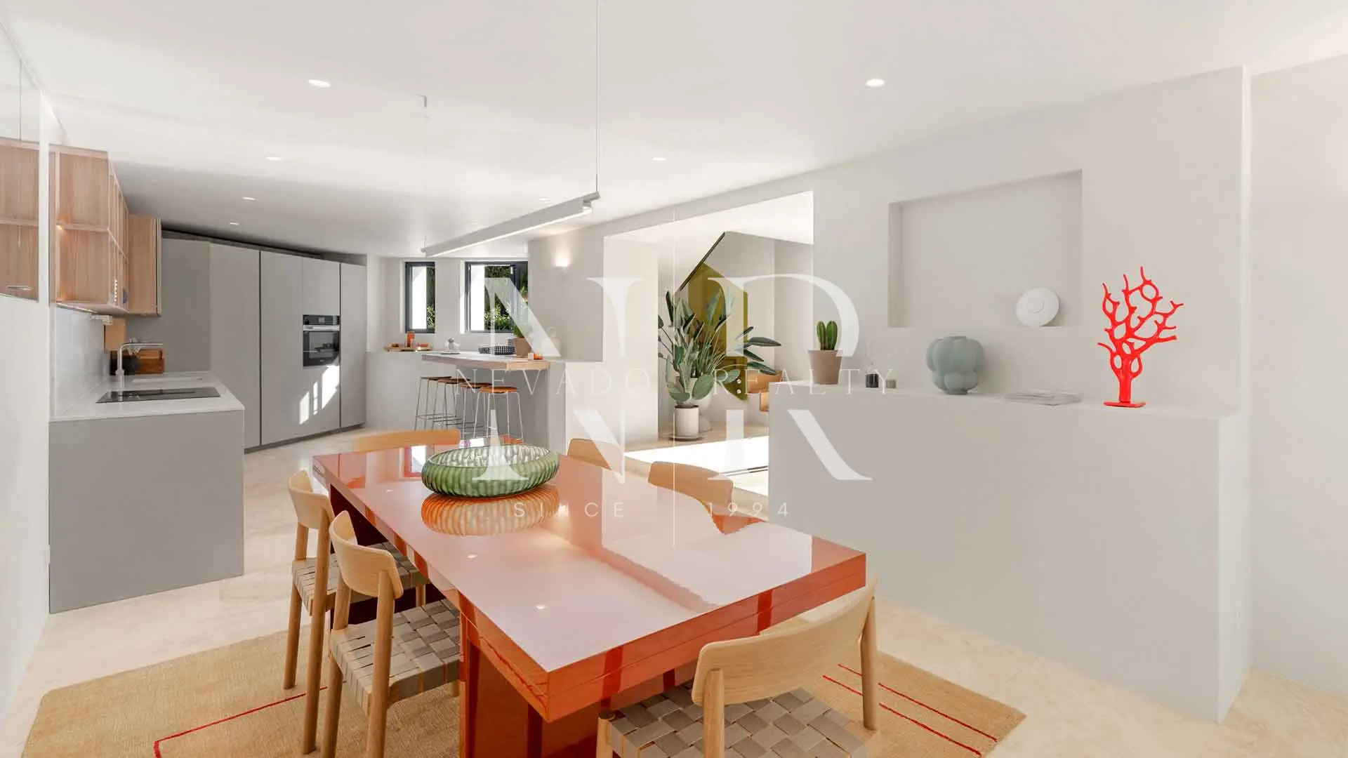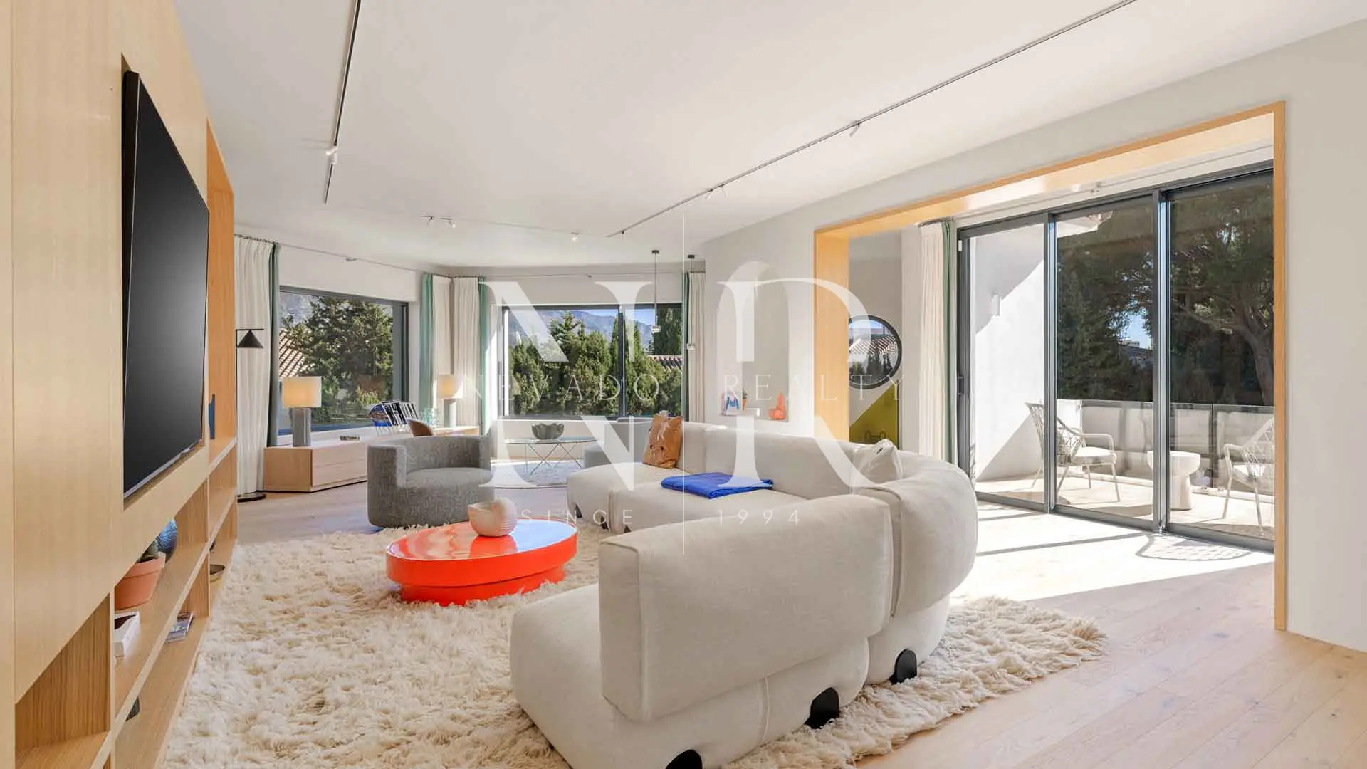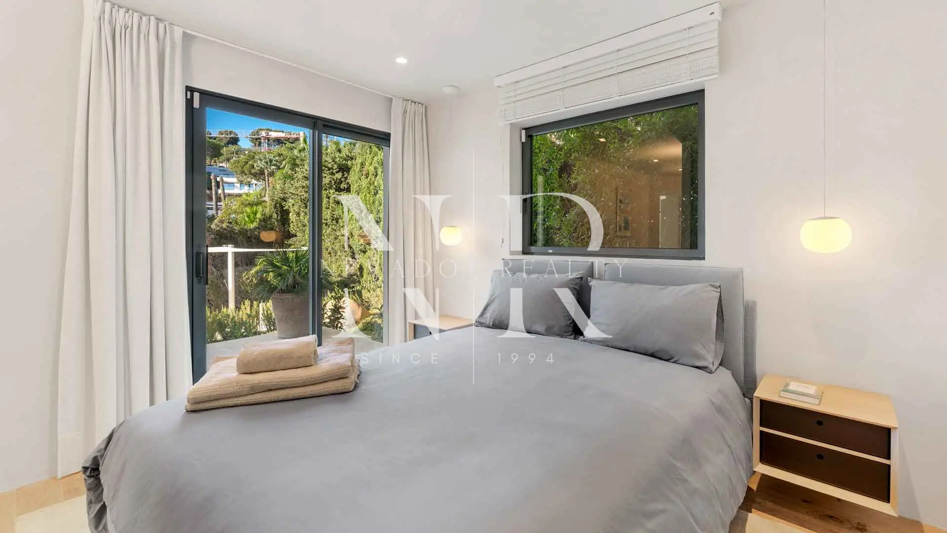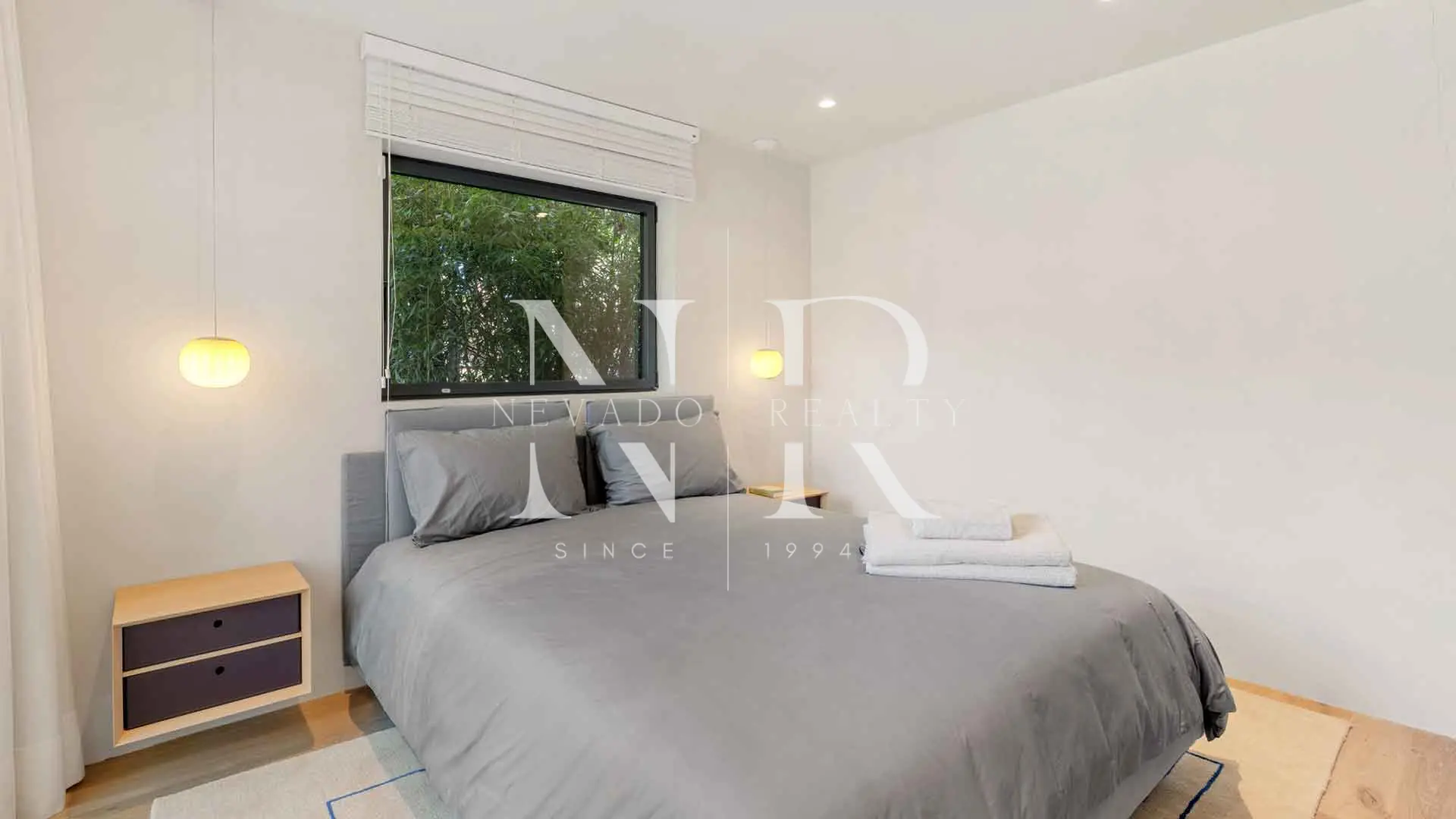 The architecture of Villa Madrisa blends Mediterranean charm with modern interiors where natural wood takes centre stage. The main floor features a fully integrated open-plan kitchen and dining area, equipped with high-end appliances. The living room is notable for its brightness, opening onto an outdoor chill-out area. The master bedroom has been designed as a private retreat, with large windows overlooking the garden and a spa-style en-suite bathroom.