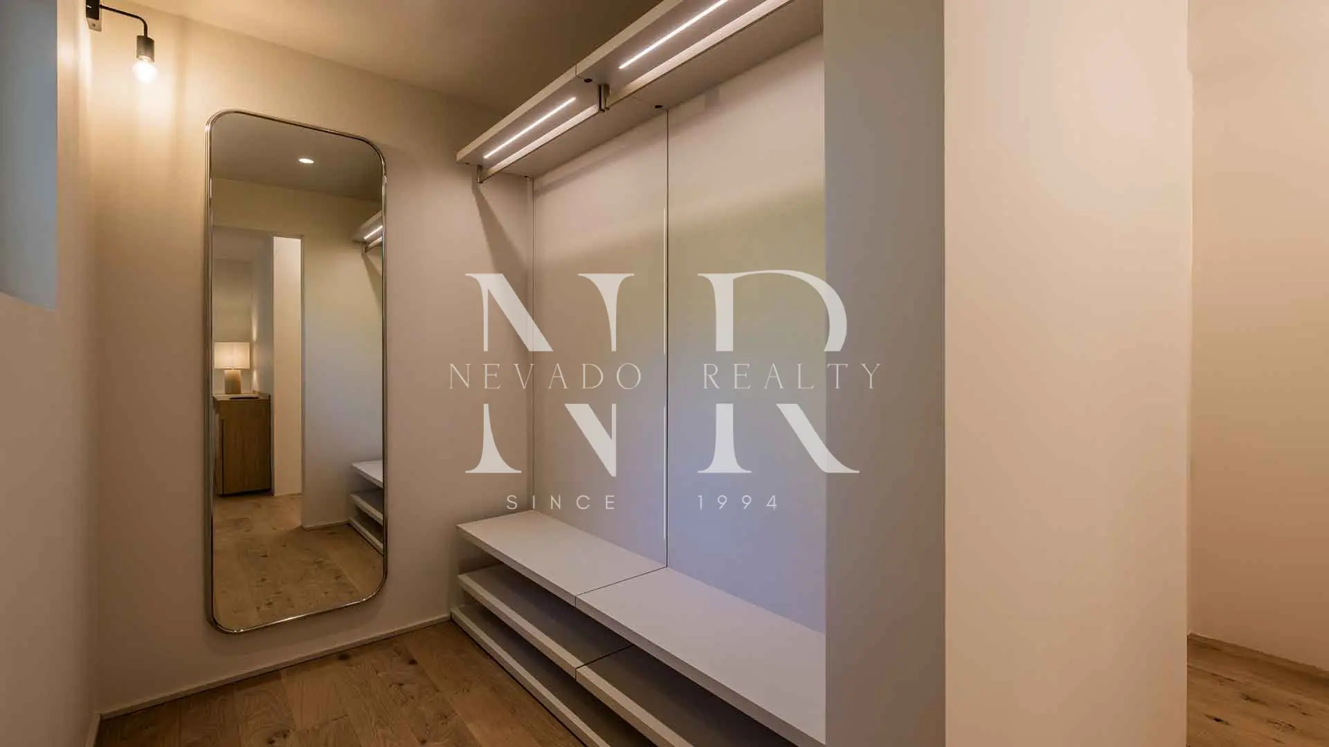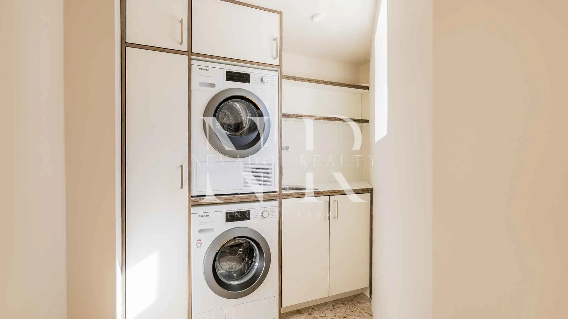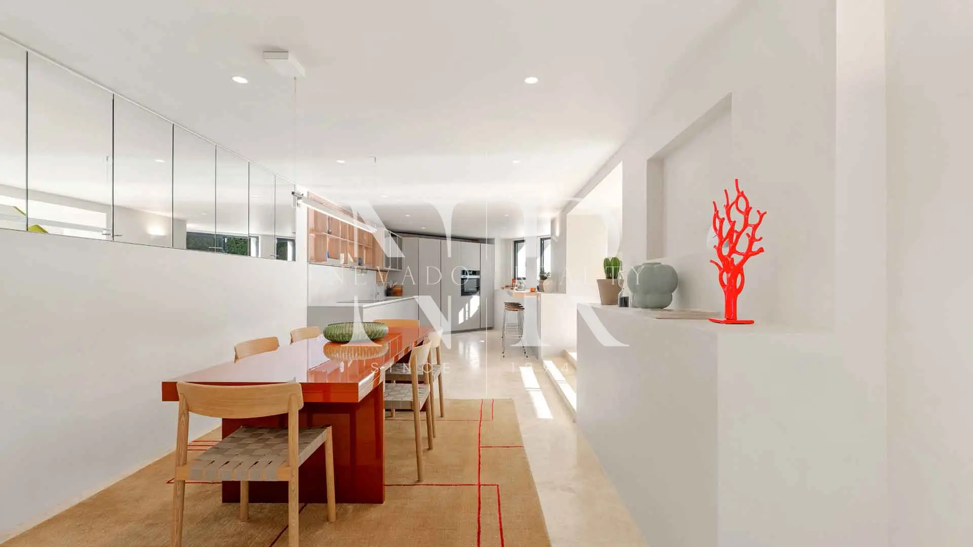 The property sits on a 1,006 m² plot surrounded by a mature, lush garden that guarantees complete privacy. The outdoor area includes a private swimming pool surrounded by relaxation areas and terraces totalling 86 m². The landscaping has been carefully designed to integrate mature trees with the architecture, creating an atmosphere of natural retreat in a luxury urban location. Furthermore, it features a separate entrance with a covered parking area (carport) with space for two cars.