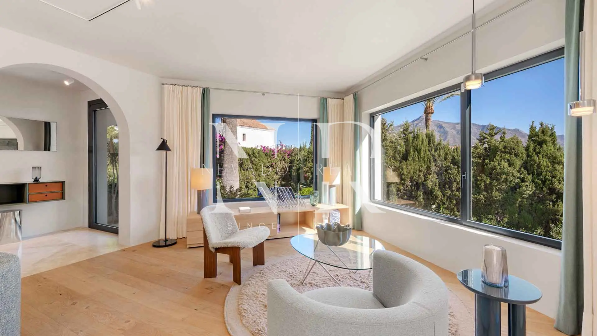 Villa in Las Brisas, Nueva Andalucía, next to the golf course, for sale. This is a Mediterranean-contemporary style property situated in the heart of Las Brisas, Nueva Andalucía. Priced at €2,995,000, the property offers 262 m² of floor space on a 1,006 m² plot. It features 4 bedrooms, 4 bathrooms, a private swimming pool and views of La Concha, standing out for its design that strikes a balance between rustic warmth and modernity.