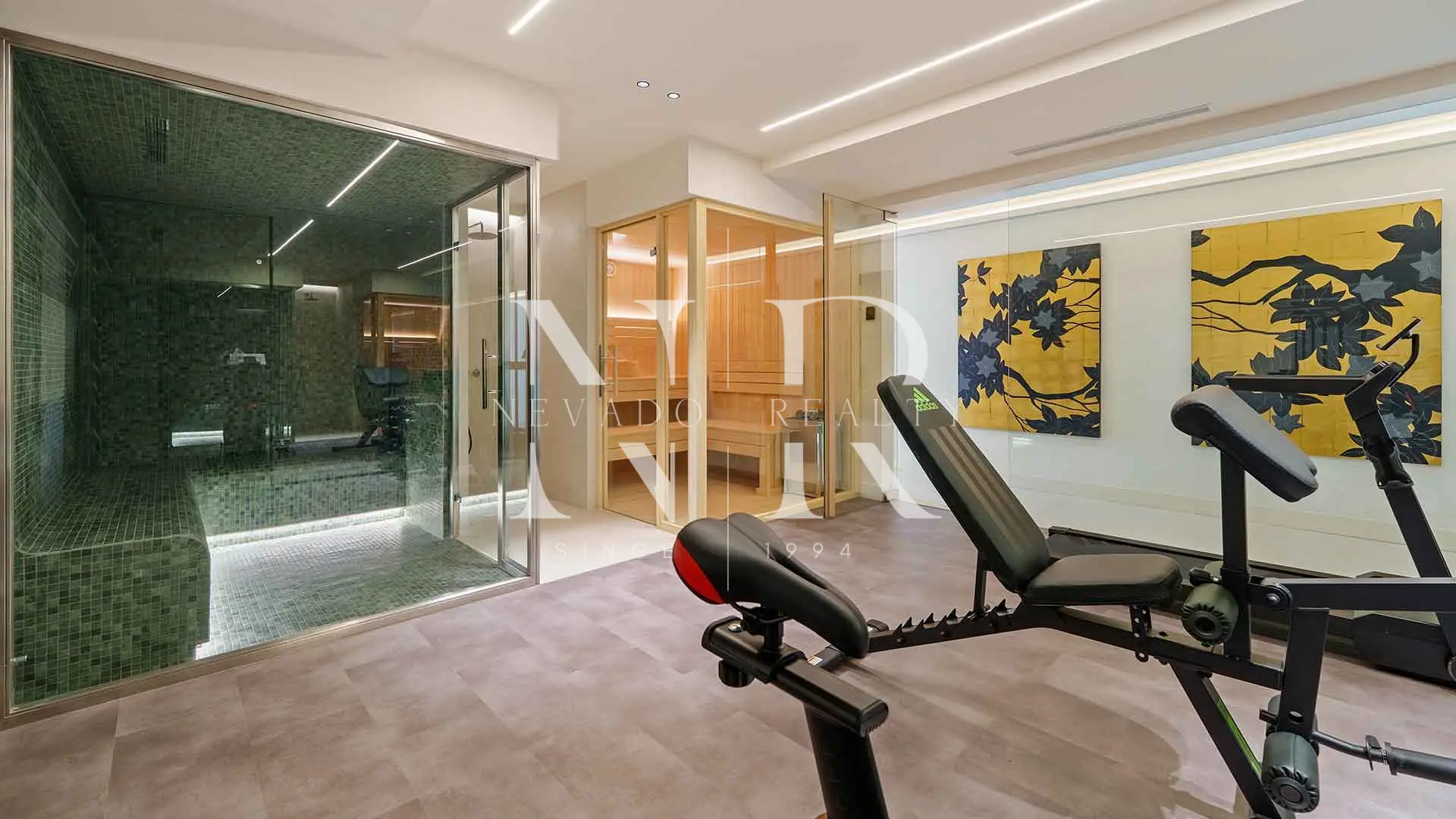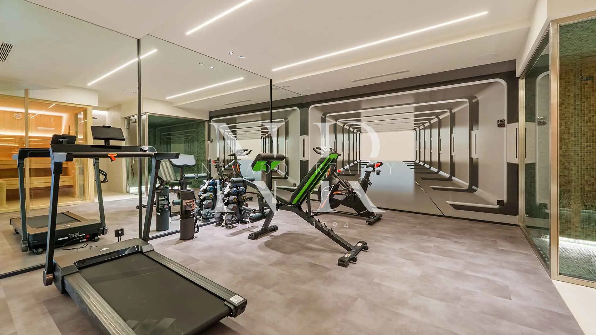 On the lower level, the wellness area includes a fully equipped gym, as well as a sauna and Turkish bath with glass enclosures. A closed garage, along with a secure entrance, completes this exclusive villa designed for a contemporary seaside lifestyle.