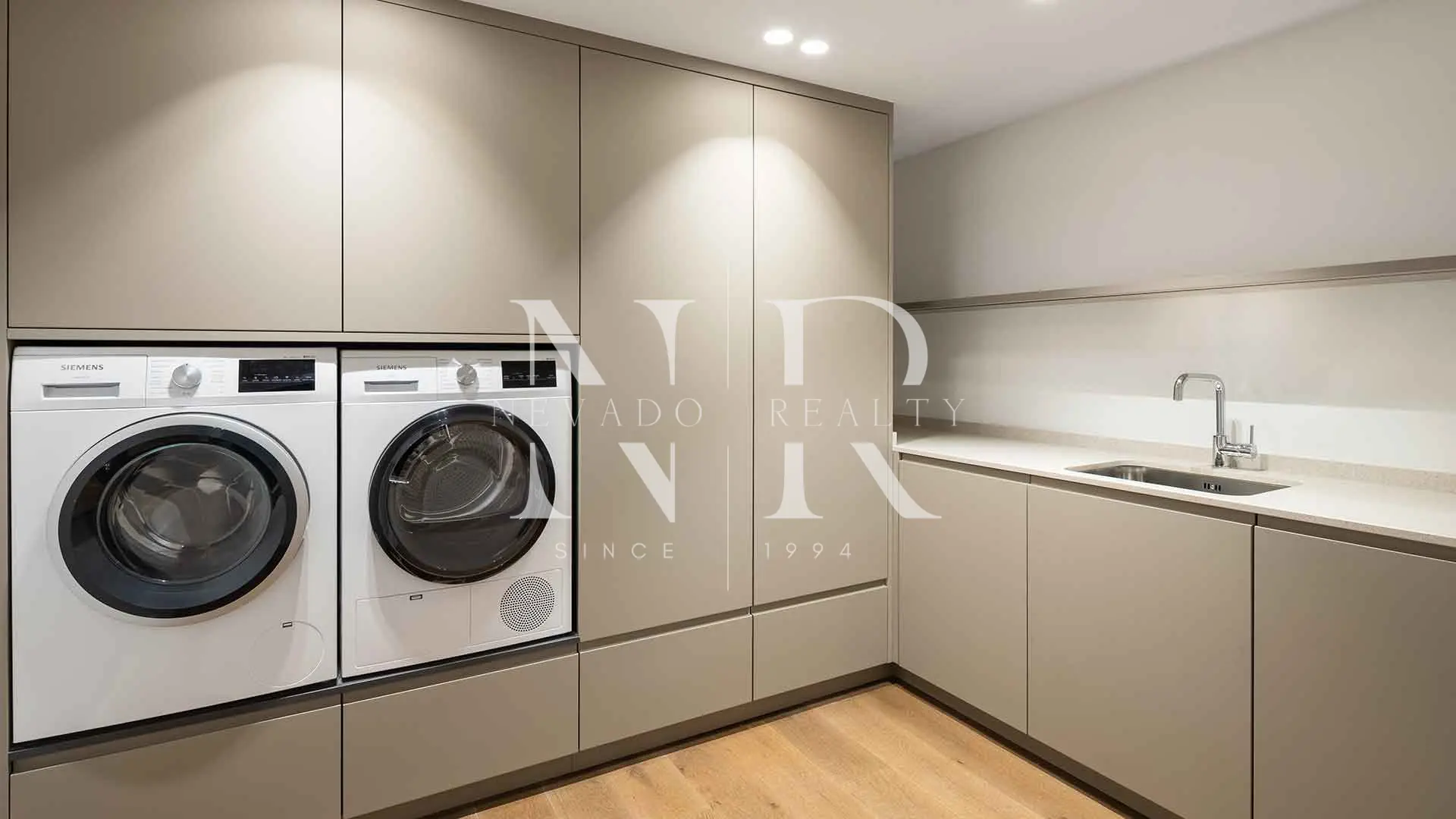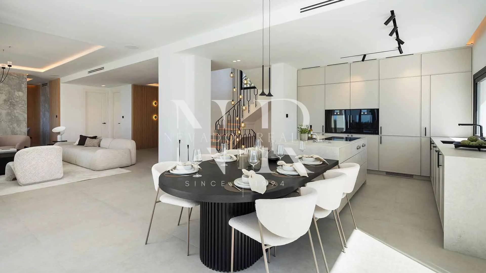 The property features five bedrooms and five bathrooms, as well as a guest toilet, arranged to offer comfort, privacy and a high-end residential experience. The main floor opens onto a spacious open-plan living area, where large windows integrate the landscape into daily life and visually extend the spaces towards the terraces and garden. Adjacent to this social area is an elegant dining room and a bespoke Danish-designed kitchen, fitted with high-end Gaggenau and Siemens appliances, Dekton worktops and lacquered cabinetry, creating a functional and aesthetically impeccable environment.