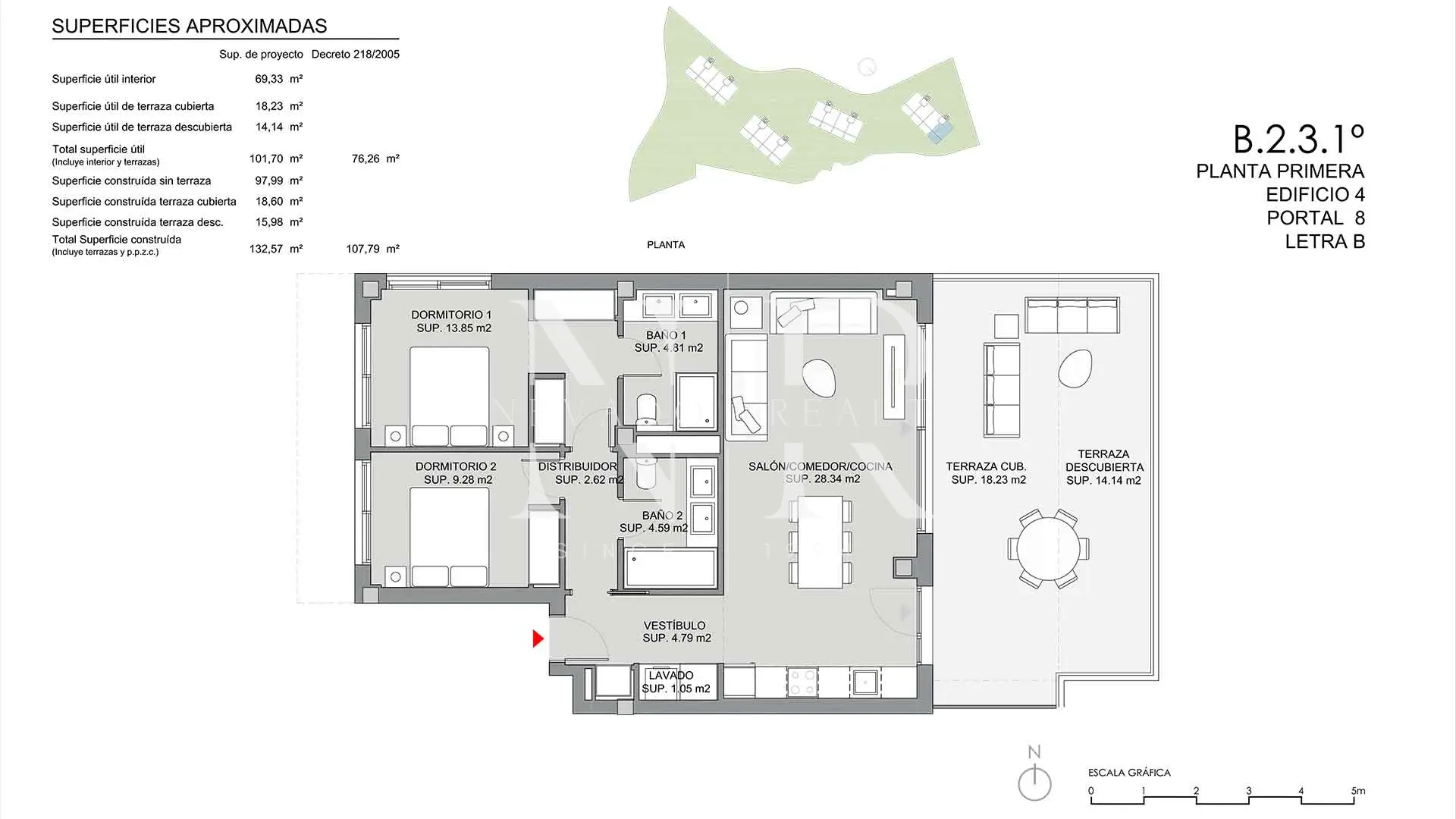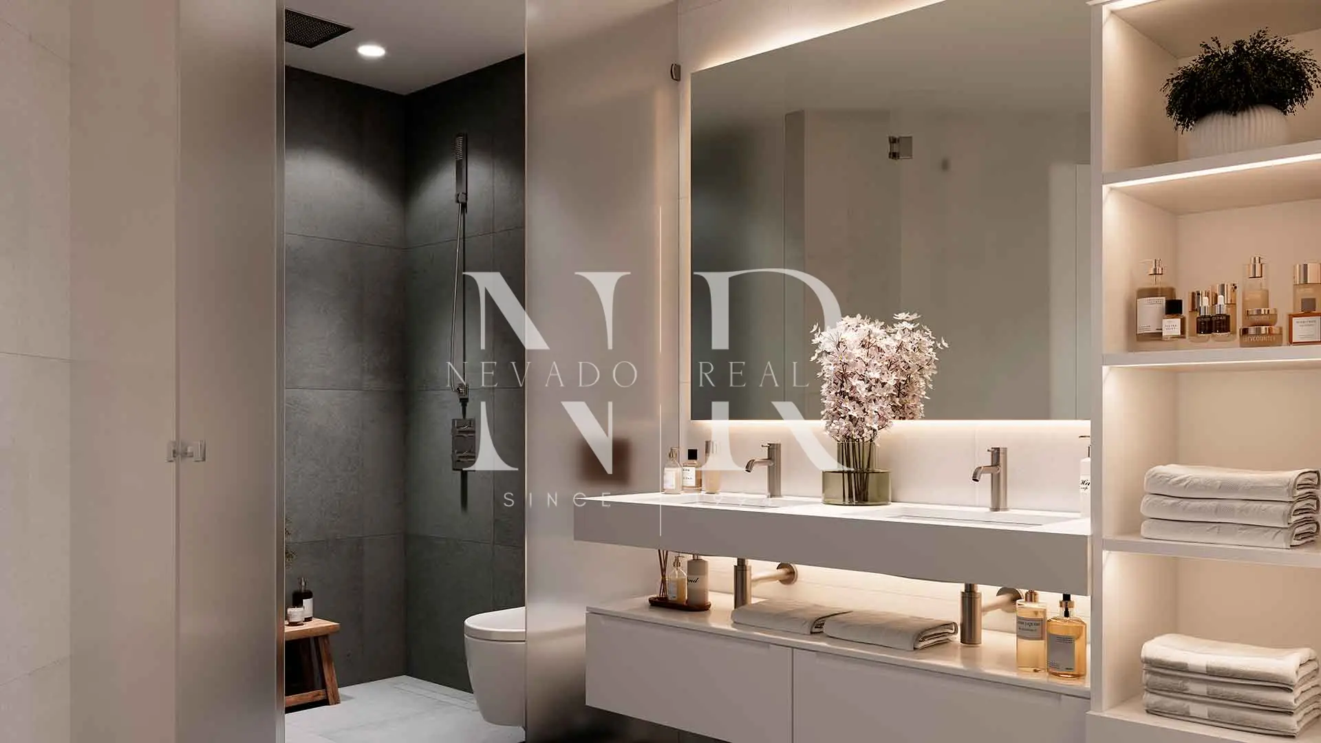 The property stands out for its clear functional layout. It features an open-plan space of 28.34 m² that combines the living room, dining room and kitchen, removing visual barriers to the terrace. The sleeping area comprises a master bedroom with an en-suite bathroom and a second bedroom. The specifications include underfloor heating via aerothermal energy, aluminium joinery with thermal breaks, and large-format porcelain tiles that blend the interior with the 32 m² of outdoor space.