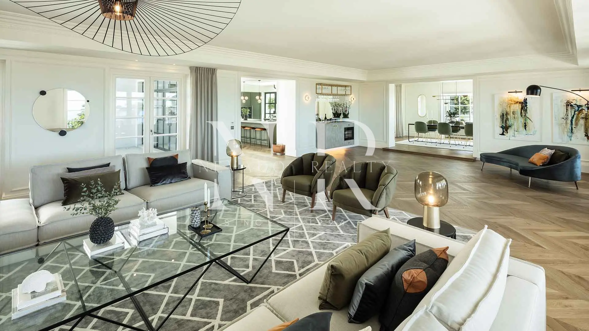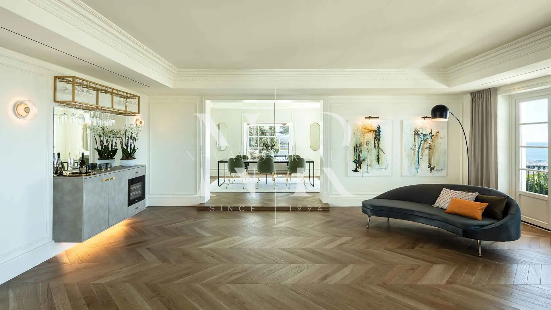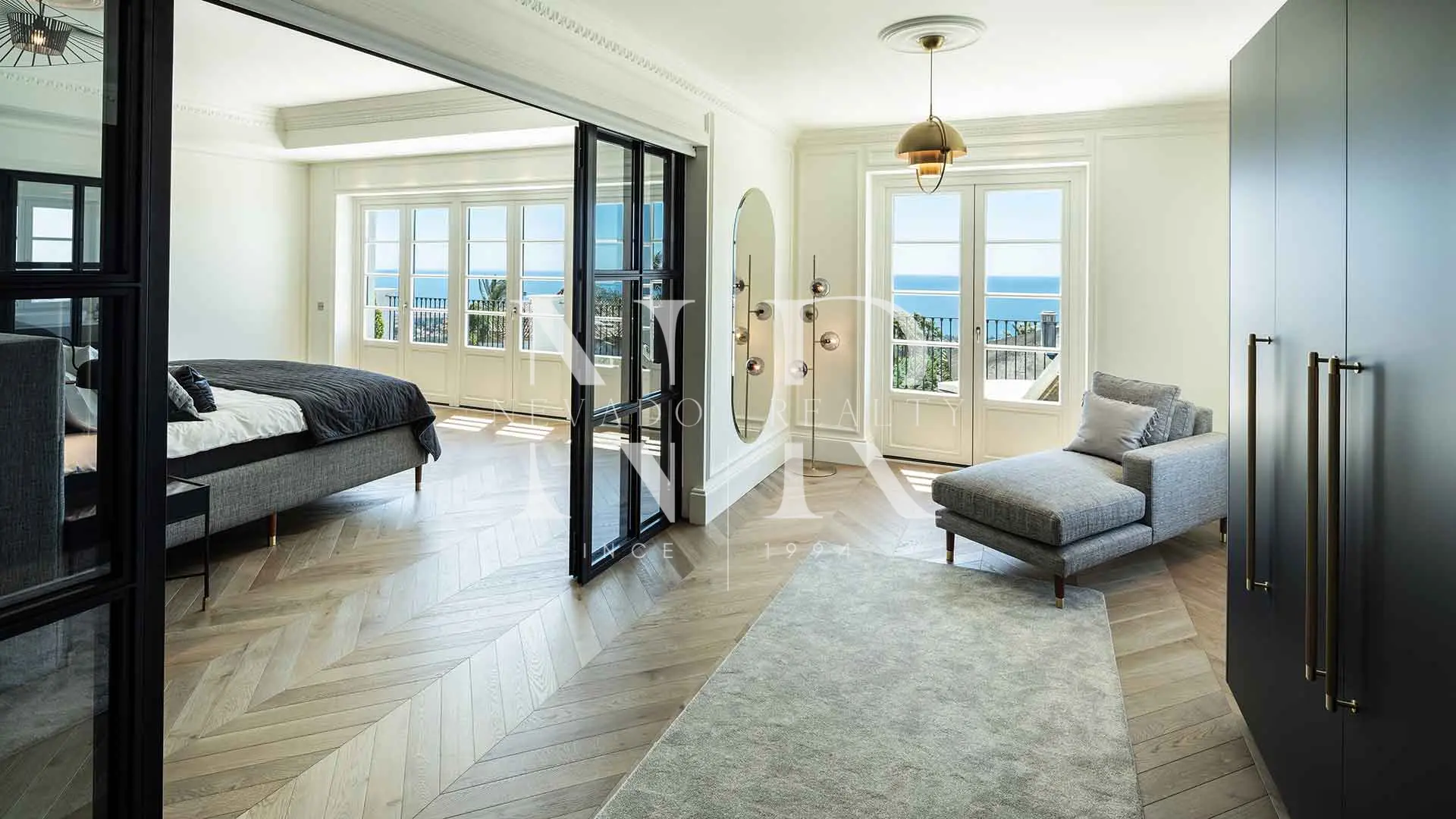 • Main Floor: Features multiple interconnected areas offering views of the garden and the sea. It includes a designer kitchen with a central island and a guest suite with its own dressing room.