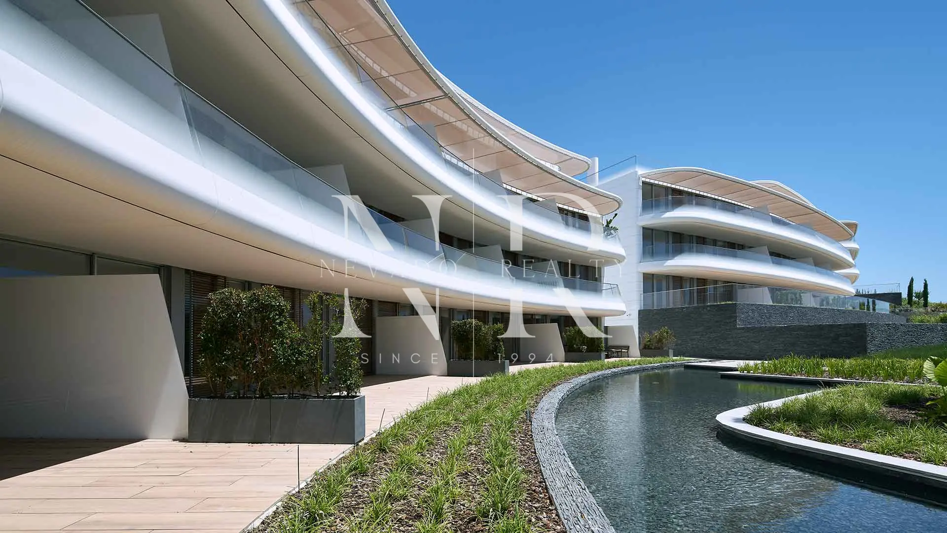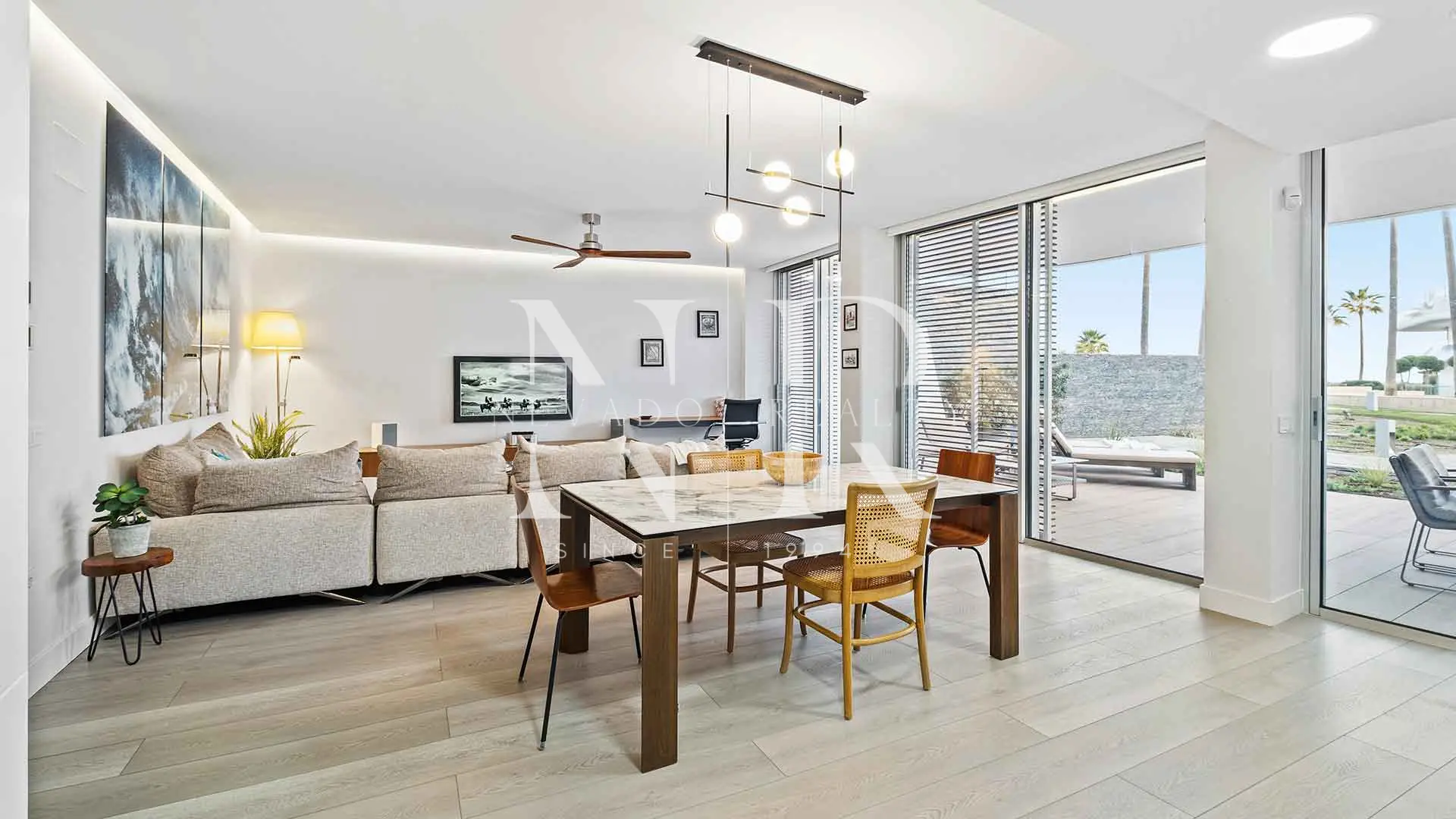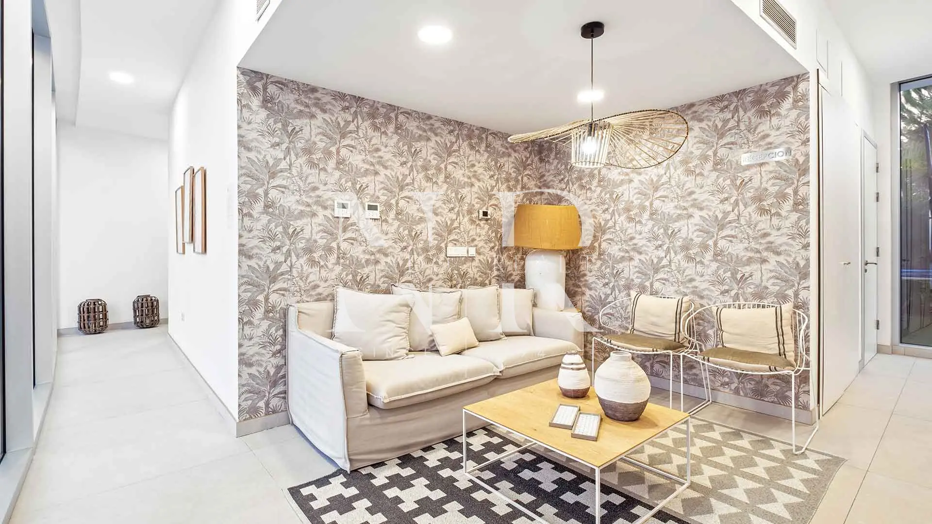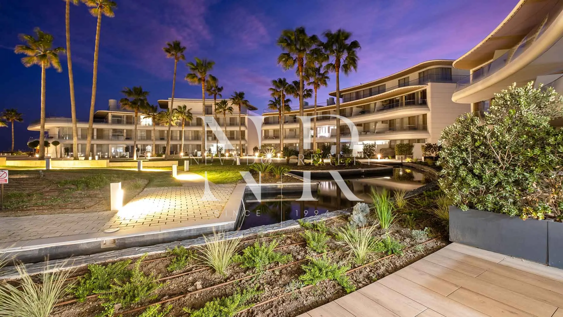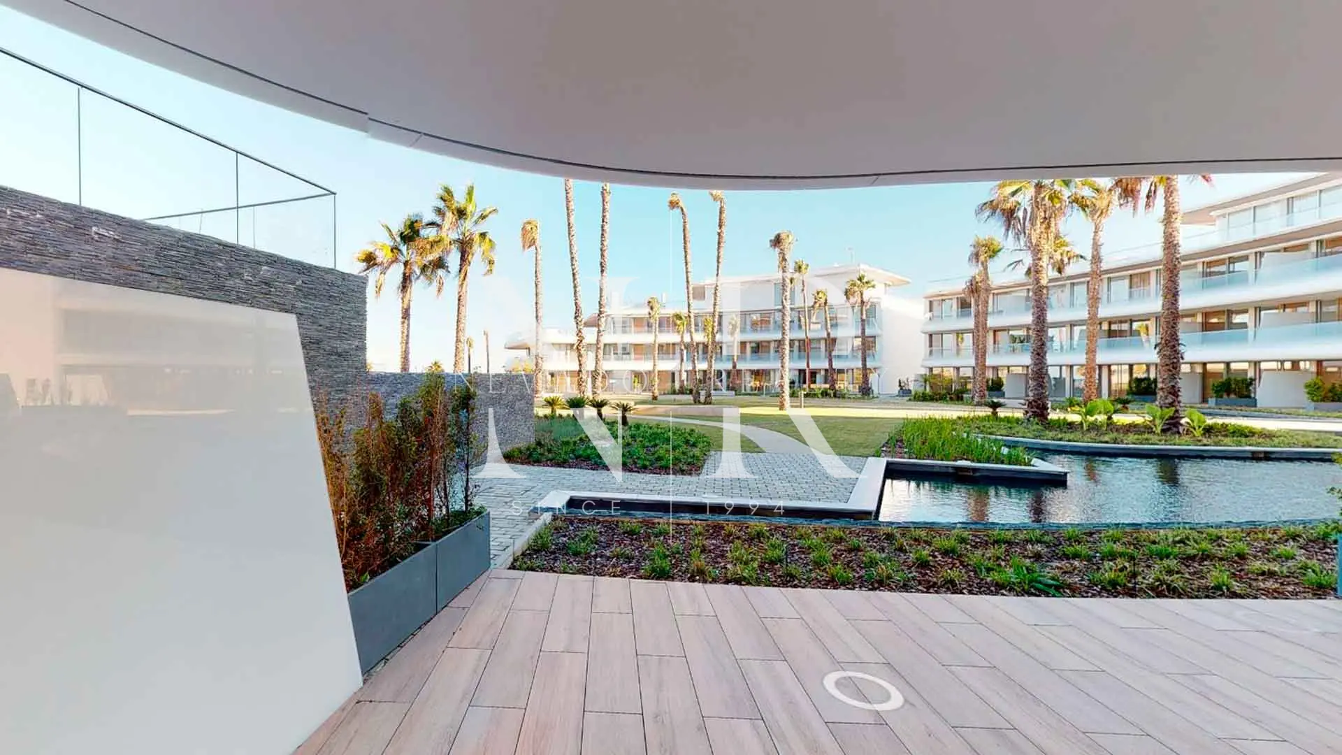 The apartment features a bright and open layout, with a south/west orientation where the living and dining area flows seamlessly into a contemporary kitchen, fully equipped with high-end appliances. Floor-to-ceiling windows allow the living room to connect smoothly with a spacious semi-covered terrace and small garden, ideal for sunbathing and relaxing, with views of the communal garden and a small pond. This apartment offers direct access to the communal infinity pool, the coastal path, and the Mediterranean Sea.