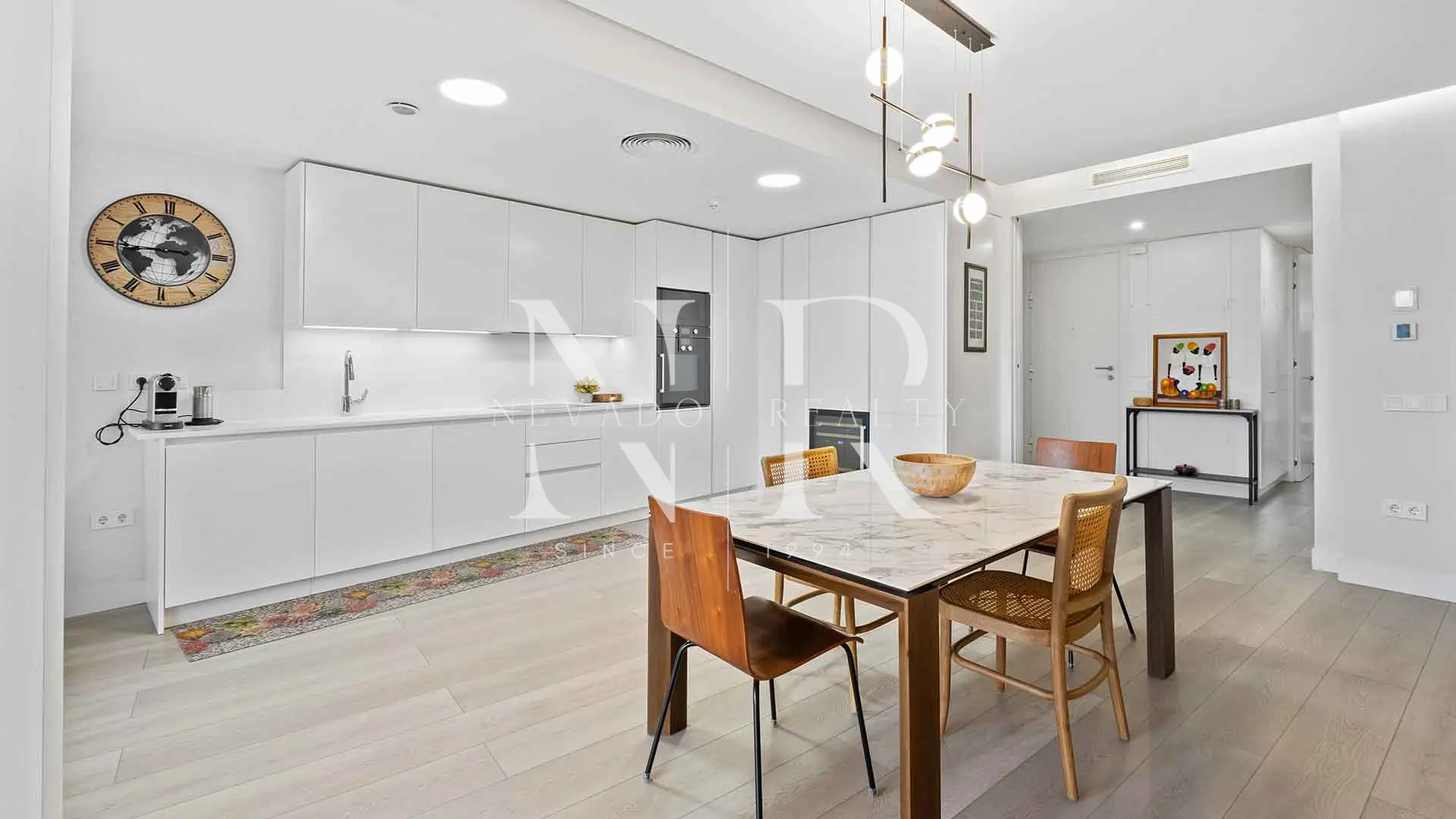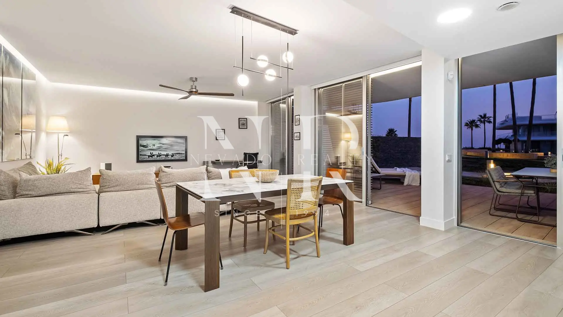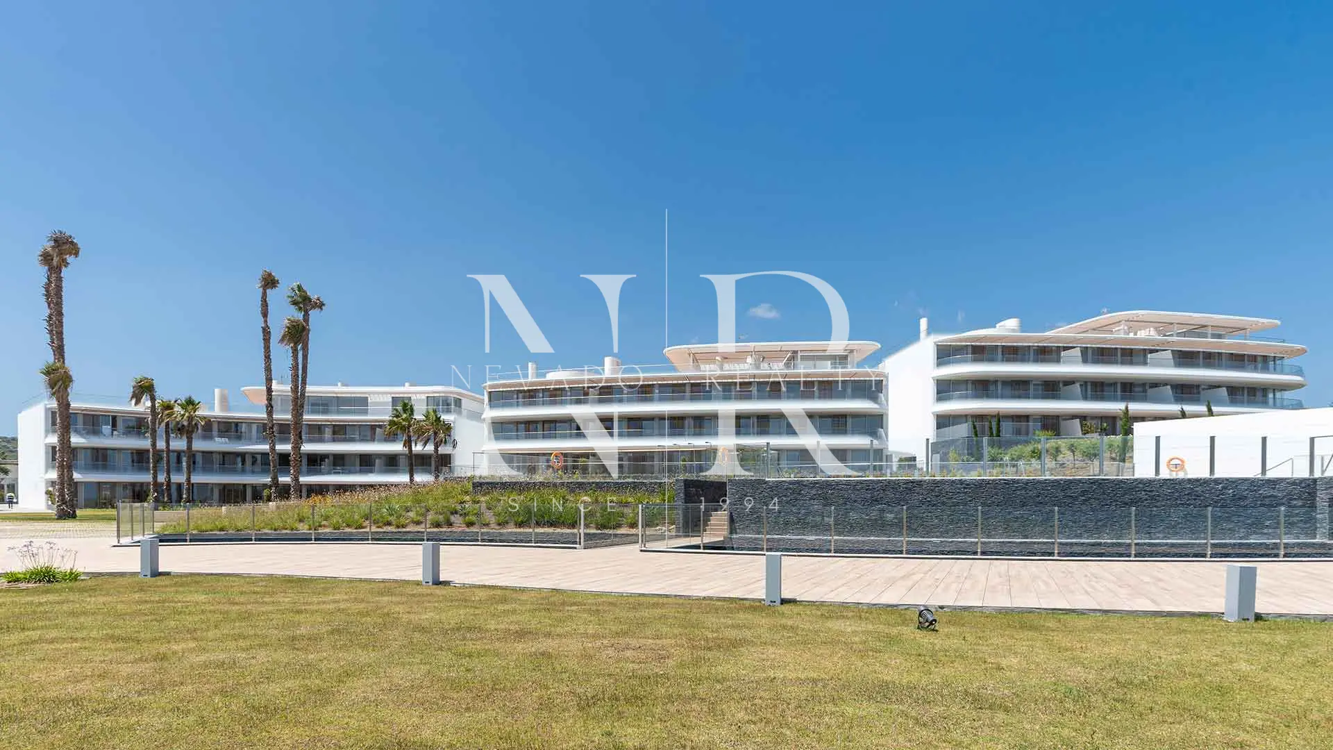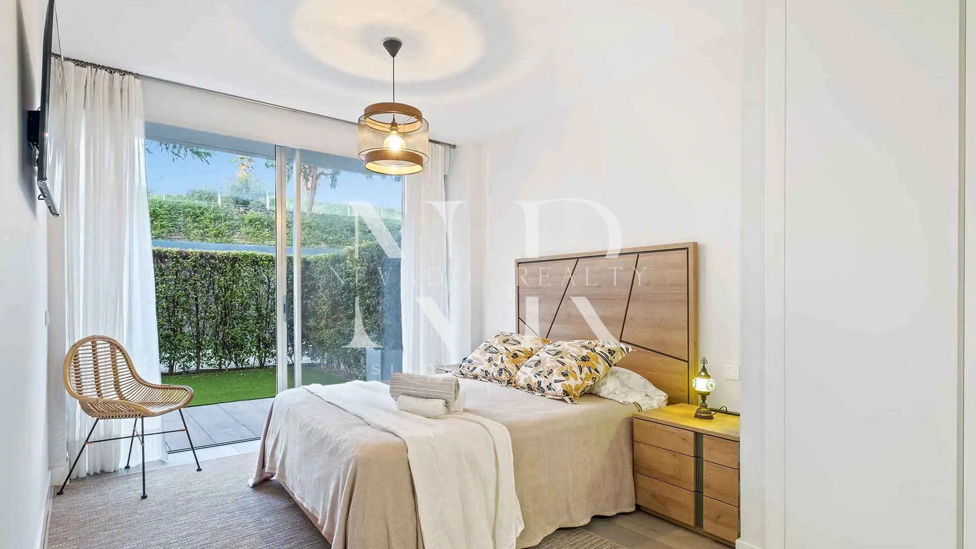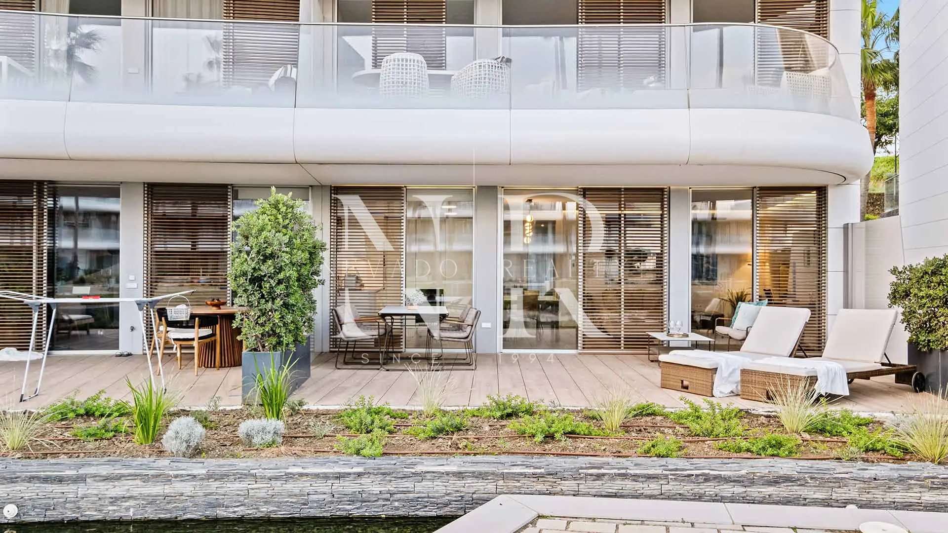 The apartment features a bright and open layout, with a south/west orientation where the living and dining area flows seamlessly into a contemporary kitchen, fully equipped with high-end appliances. Floor-to-ceiling windows allow the living room to connect smoothly with a spacious semi-covered terrace and small garden, ideal for sunbathing and relaxing, with views of the communal garden and a small pond. This apartment offers direct access to the communal infinity pool, the coastal path, and the Mediterranean Sea.